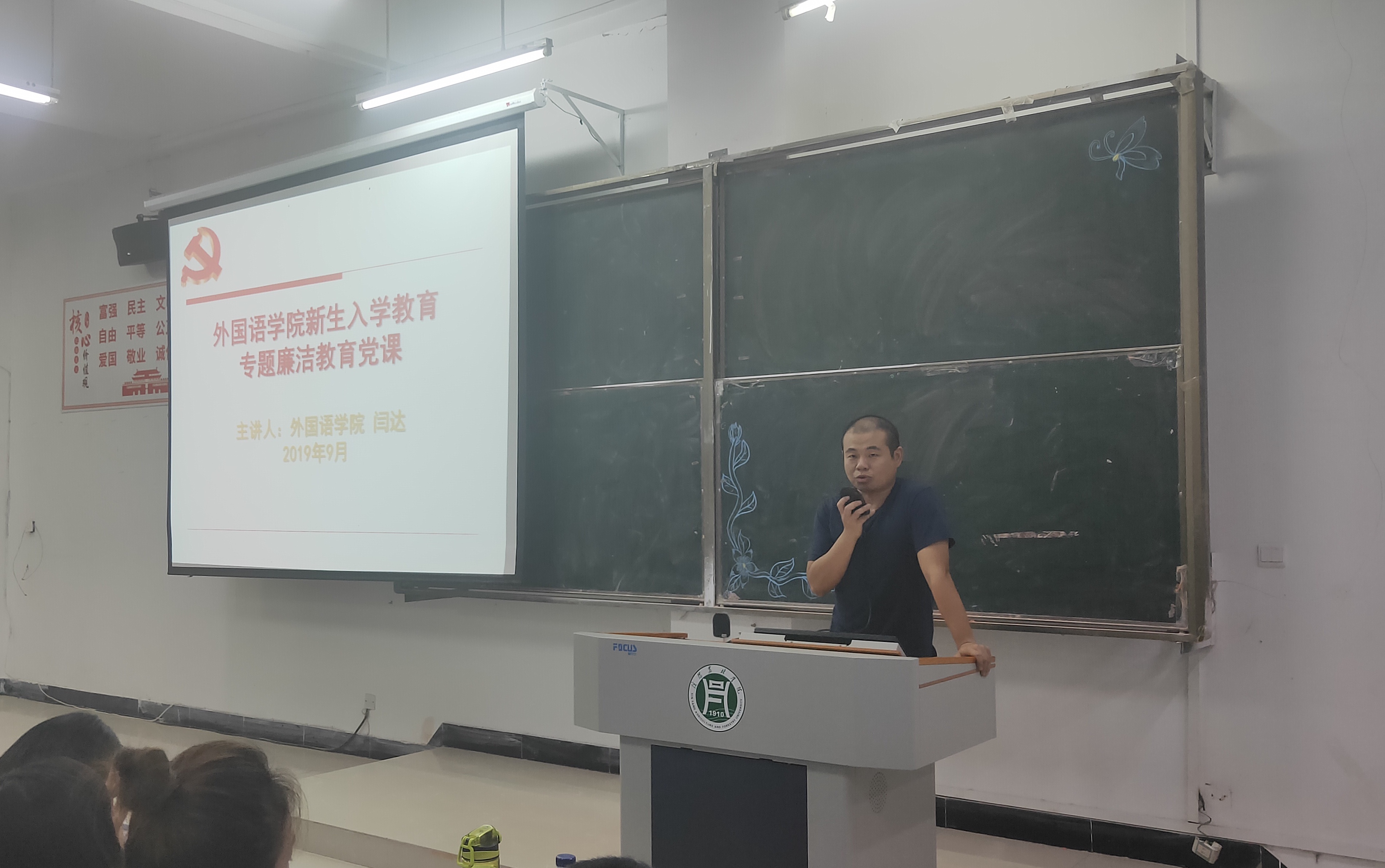 新生廉洁教育是大学生廉洁思想教育培育的起点,是一项十分重要的基础性工作。为切实提高大学生廉洁素养及道德自律意识,培养廉洁自律的思想品质,9月29日,外国语学院于E102开展了廉洁教育主题学习会。2019级新生辅导员及全体新生参加了本次学习会,会议由学院党总支纪检委员闫达主持。