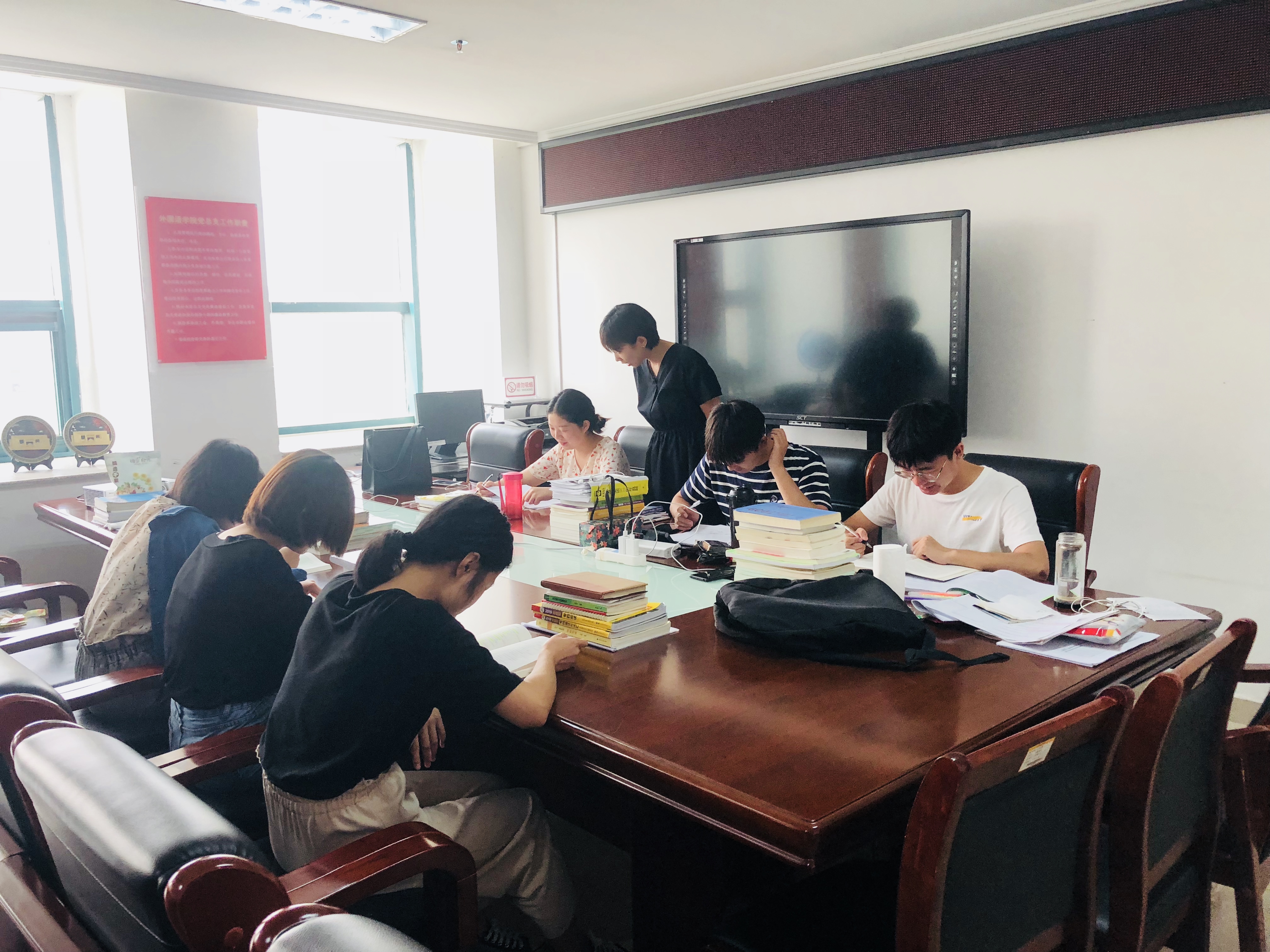 今年我院共有53名同学暑期留校参加考研复习,为进一步做好暑期考研留校管理与服务工作,学院领导和学工组成员高度重视,为学生提供考研专用自习室,每晚通过微信群、QQ群的晚检汇报加强对考研留校学子的动态管理,同时安排辅导员深入学生宿舍,相信在学院领导老师的关心和帮助下,我院考研成绩会更上一个新的台阶!(外国语学院)