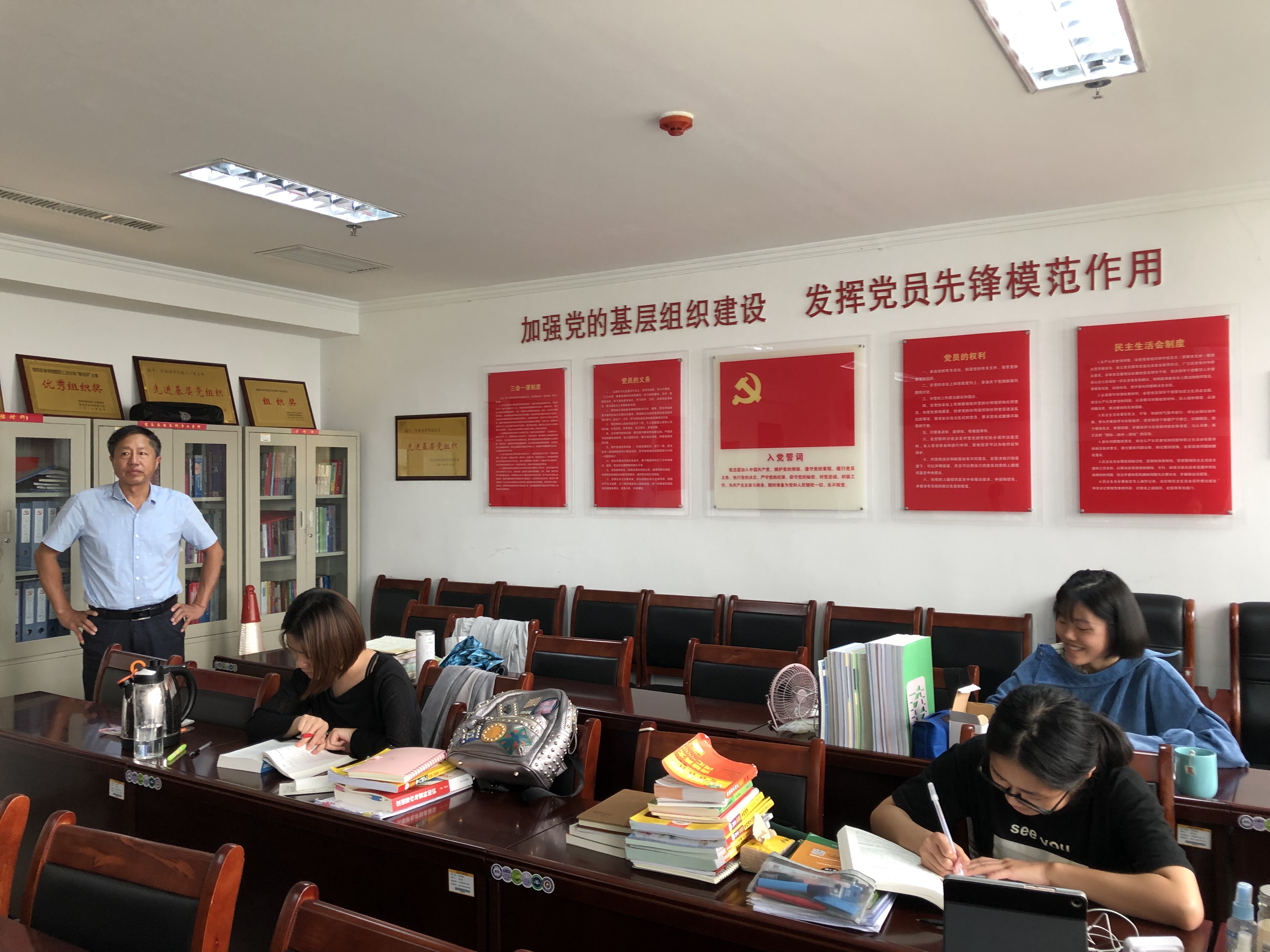 8月14日上午,我院党总支书记张志强、团总支书记范琼琼深入暑期留校考研自习室,看望慰问2016级商务英语本科专业考研学子。