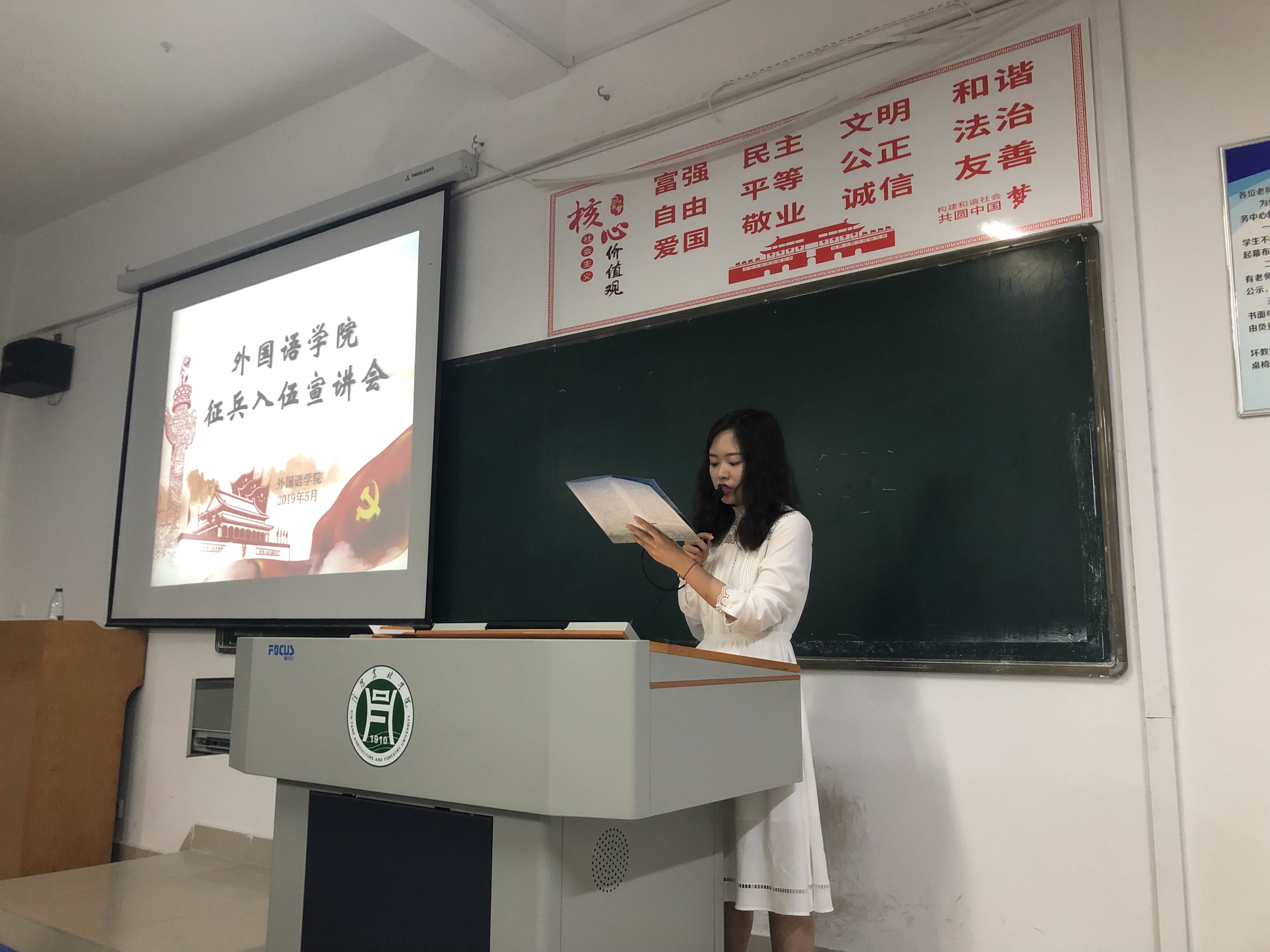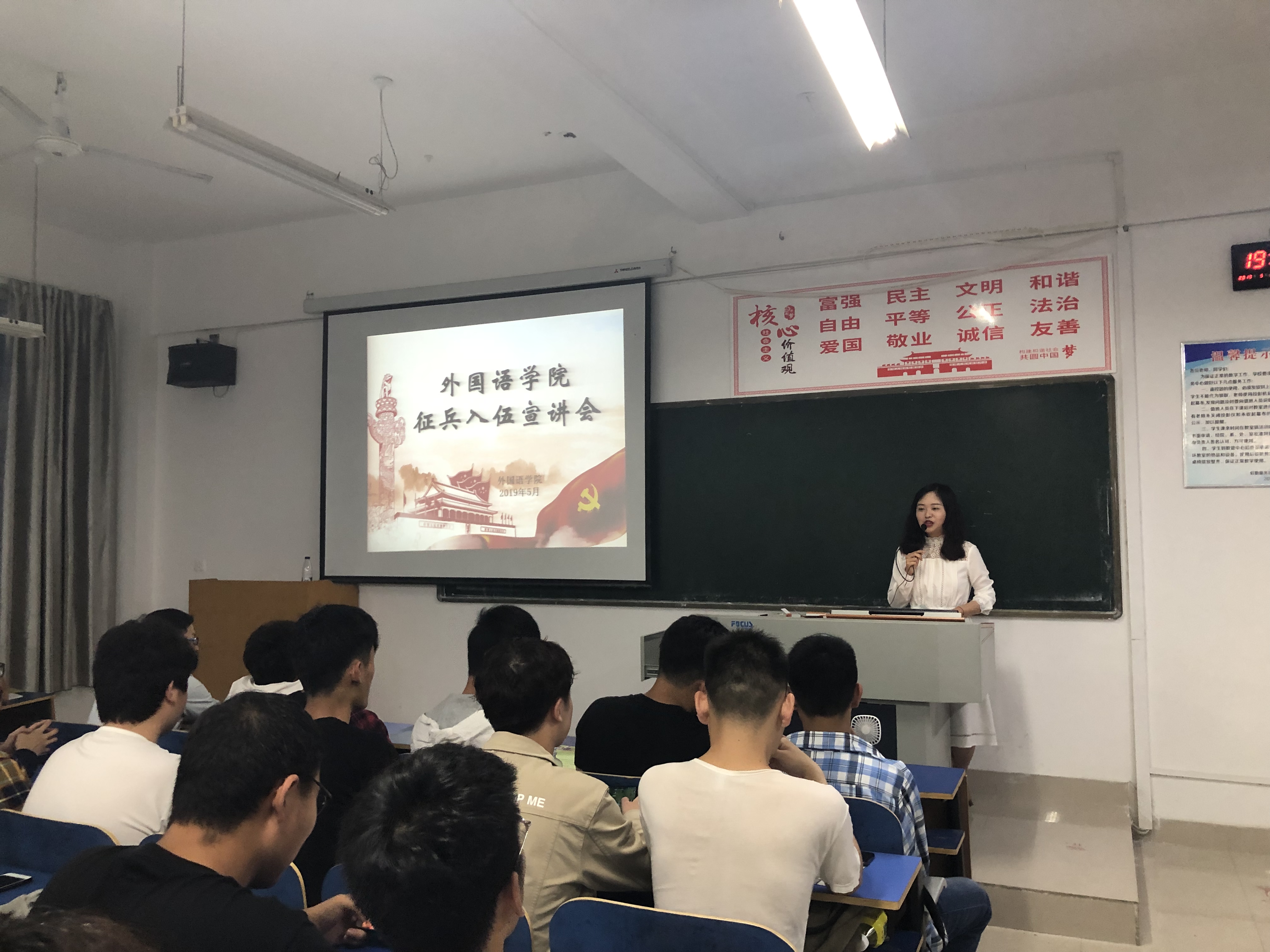 为响应国家号召,鼓励大学生积极参军,提高兵源征集质量,推进国防和军队现代化,做好2019年大学生应征入伍工作,2019年5月12日晚上19:00,外国语学院于一教D302召开了征兵入伍宣讲会。会议由我院武装专干朱俊梵老师主持,我院2018级全体男生及有入伍意向的同学积极参加了本次宣讲会。