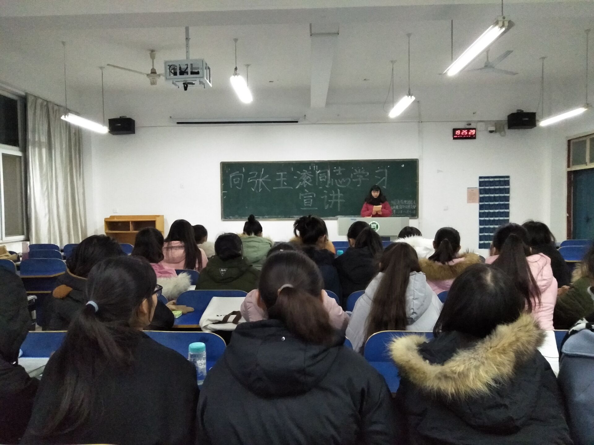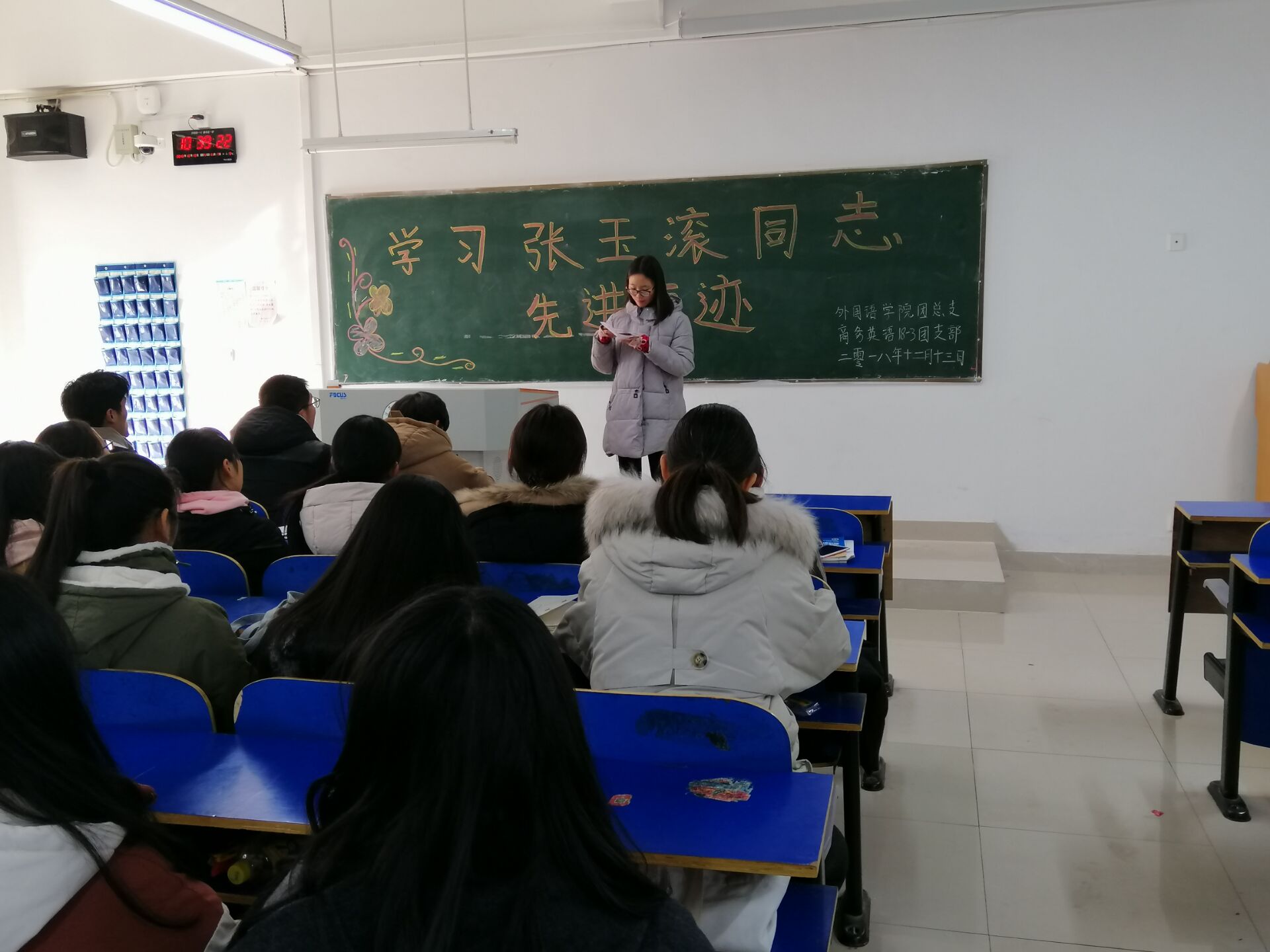 2018年12月13日,为响应张玉滚精神进高校,外国语学院召开向“时代楷模”张玉滚同志学习主题团课,18级各班相继深入学习了时代楷模张玉滚精神。