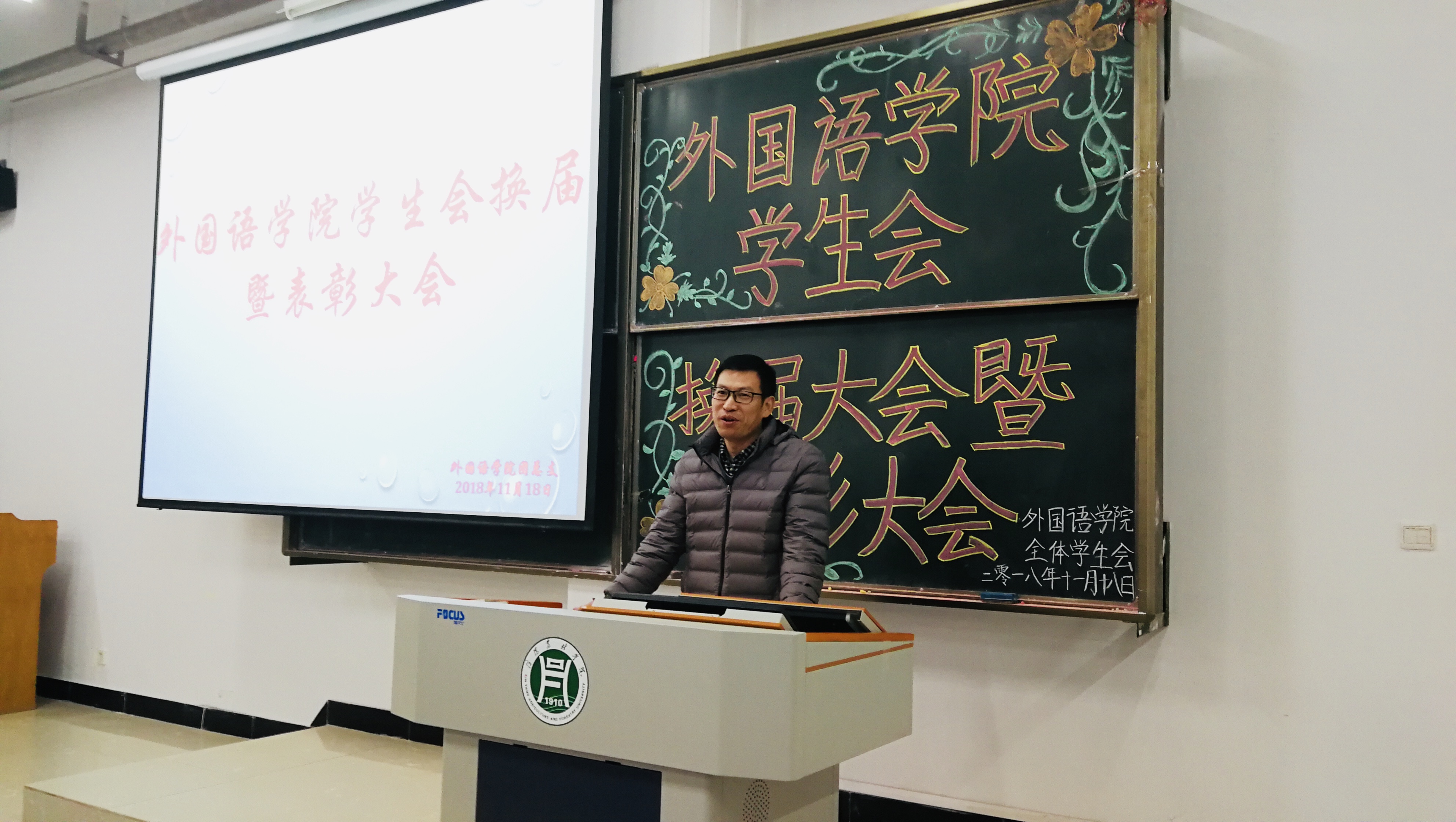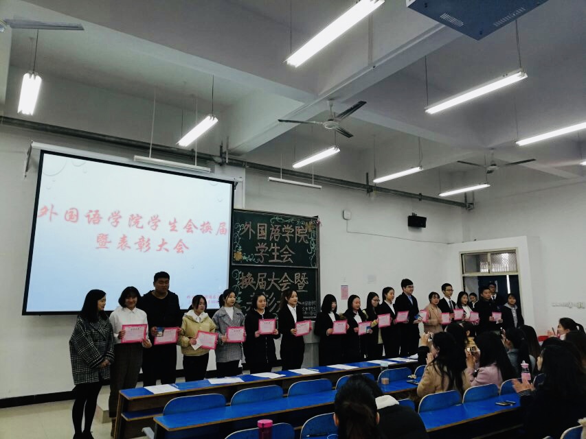 2018年11月18日下午,外国语学院在一教E201举行了外国语学院学生会换届暨表彰大会。我院组织员、学工组组长吴宏、团总支副书记范琼琼、17级辅导员朱俊梵、18级辅导员徐文君及外国语学院学生会全体成员参加了此次活动。