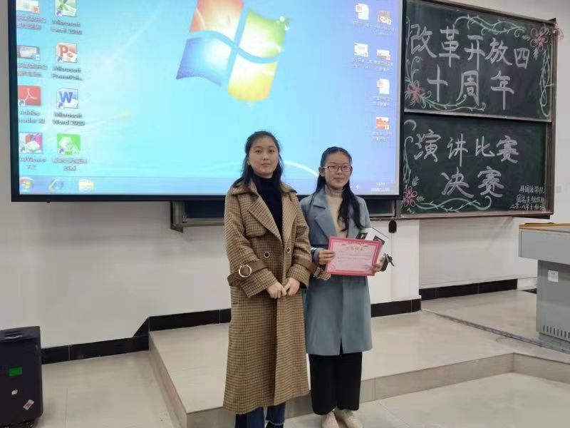 比赛开始,参赛的同学们都从不同角度出发回忆改革开放40年岁月,看今朝事物几多变迁。他们用慷慨激昂的演讲,道出了改革开放40年翻天覆地的变化:于人民,改变了吃穿住行,生活的细碎之处;于思想,改变了封闭、僵化的思想;于国家,改变了中国经济格局和未来发展的大目标。最后,高晓萌同学荣获一等奖,王文艳、陈思羽同学荣获二等奖,其他同学均获三等奖。