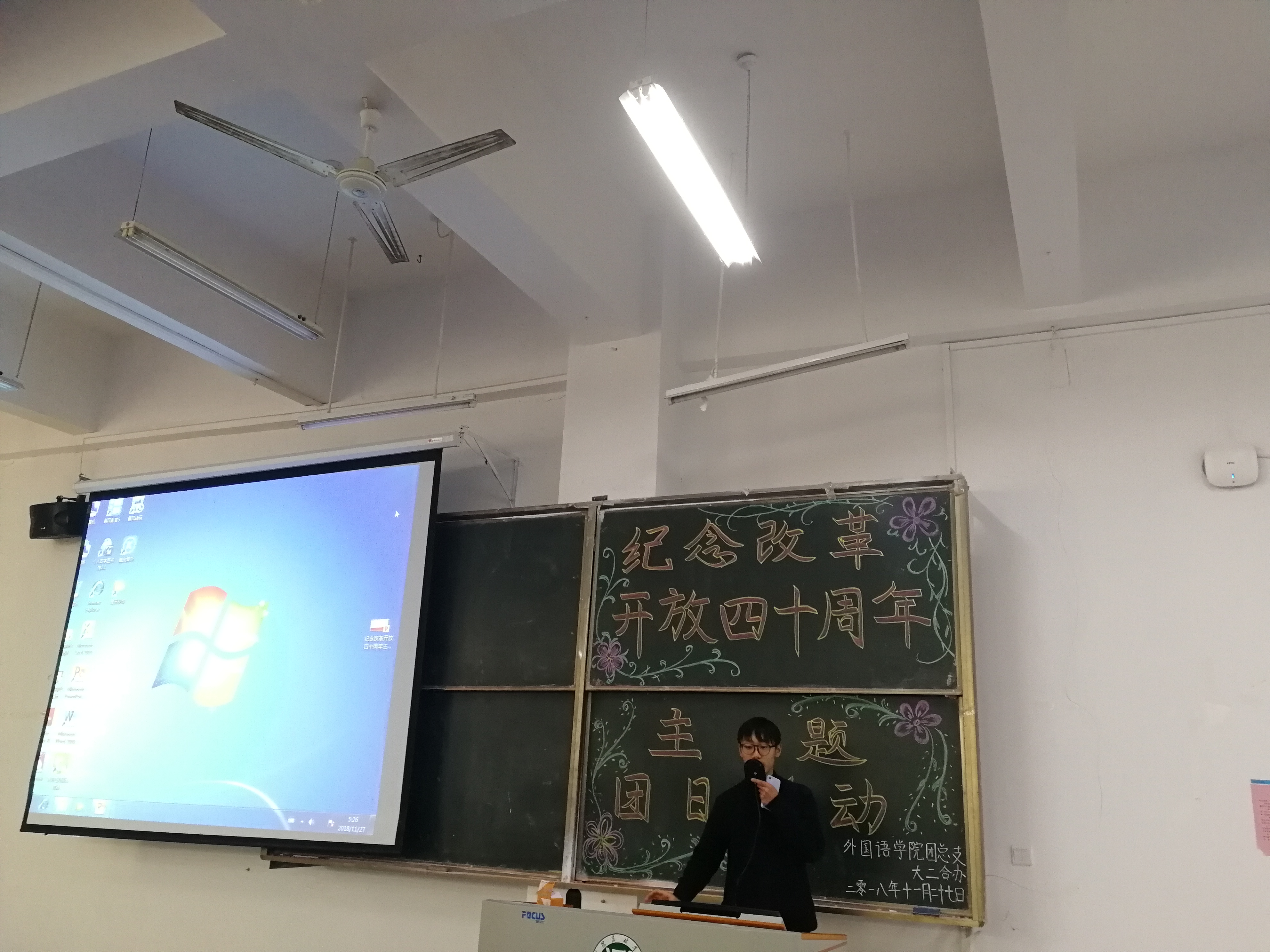 为了以实际行动学习、宣传改革开放四十年来祖国取得的伟大成就,进一步提高团支部共青团员的政治素质,培养理想远大、品德高尚、视野开阔的新时代青年团员。2018年11月27日12点半,外国语学院在一教E102举办了“庆祝改革开放四十周年”为主题的团日活动。活动由17级商务英语五班团支书马晓天同学主持,全体大二学生出席。