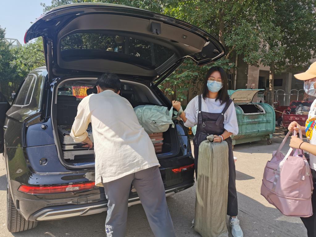 由团总支学生会各部门成员组成的志愿服务队伍在校门口、报道点和新生宿舍楼下往来忙活,学院老师也开车,大家齐上阵,帮助小萌新们搬运行李。炎炎烈日挡不住大家干劲十足。
