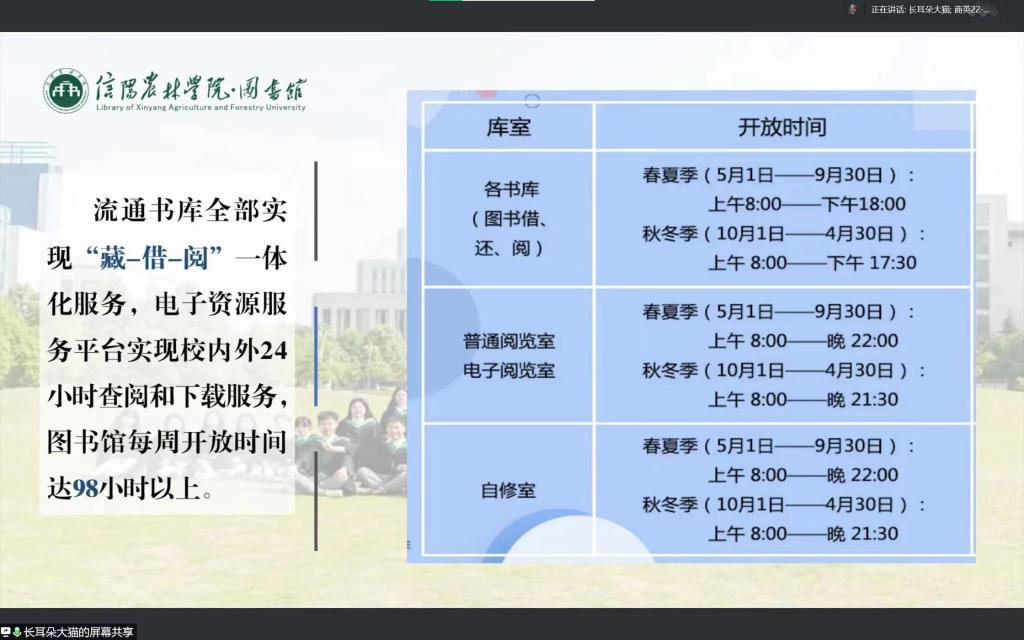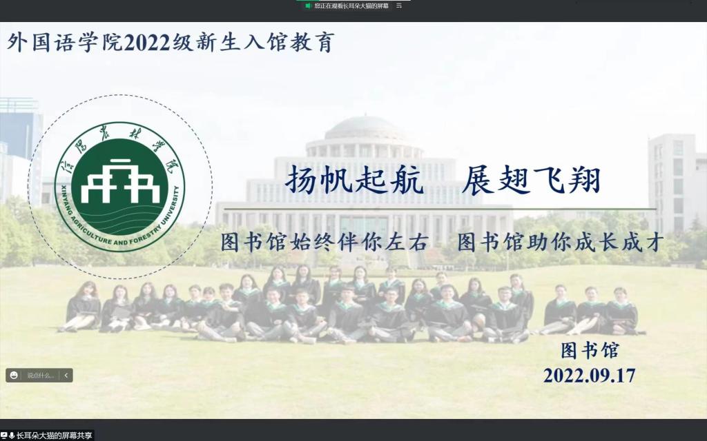 为引导2022级学生规范、正确使用图书馆资源,917日上午9点,外国语学院联合校图书馆在腾讯会议开展了以“扬帆起航 展翅飞翔”为主题的图书馆入馆教育知识讲座,本次讲座由图书馆办公室副主任姜雁老师主讲,外国语学院商务英语21-3班余佳主持,2022级全体学生参加。