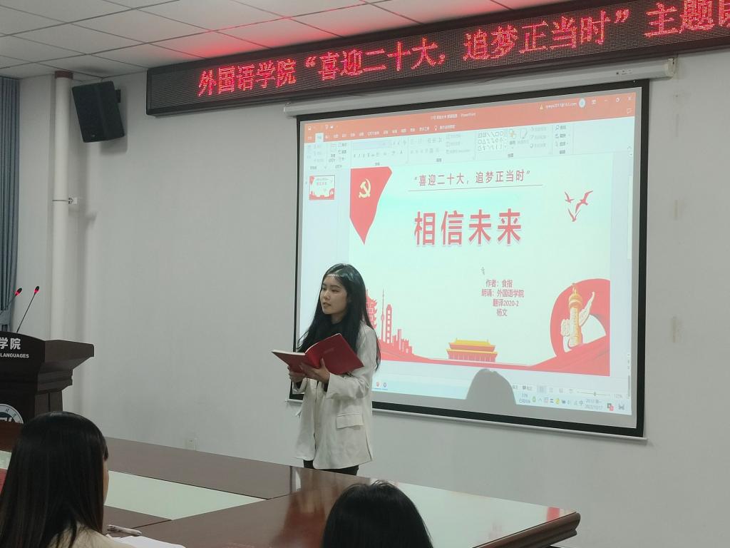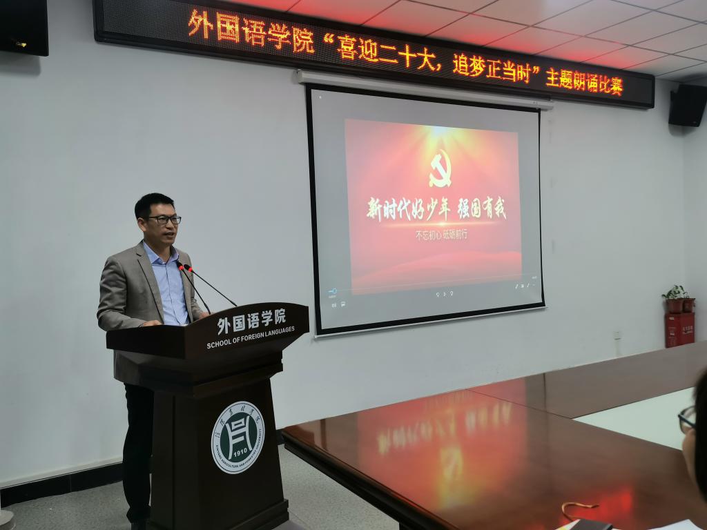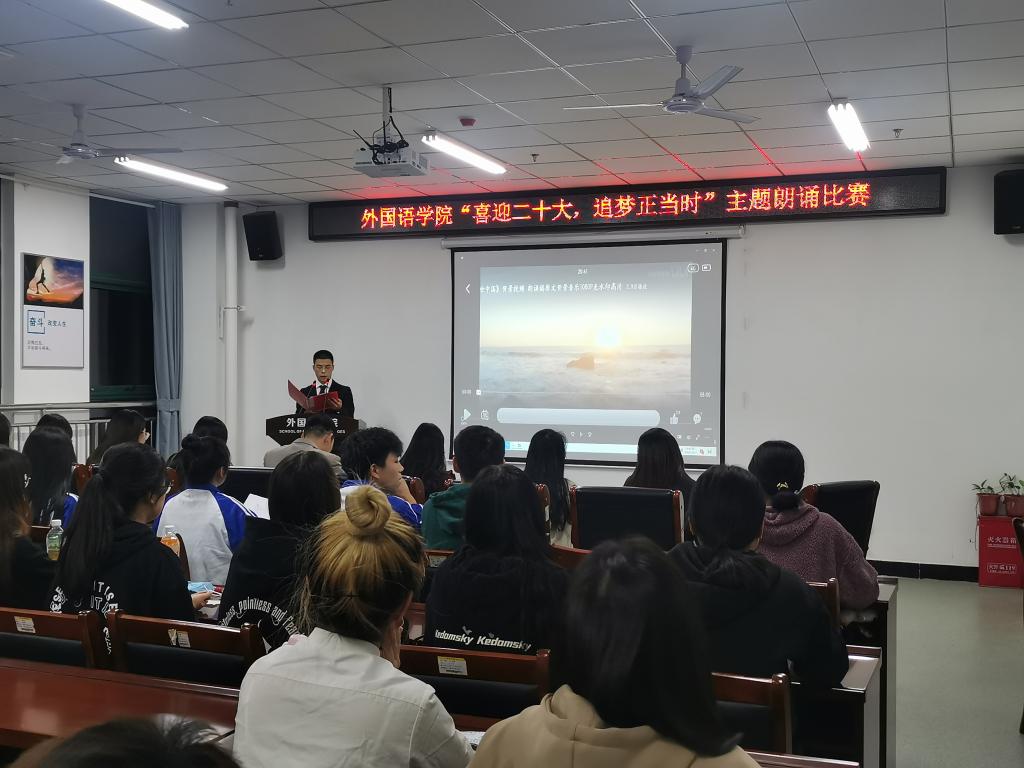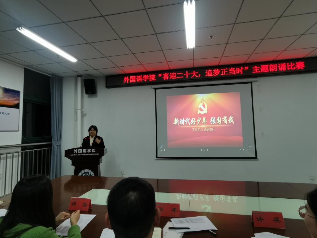 2022年10月17日,外国语学院于文学艺术楼402举办了“喜迎二十大,追梦正当时”主题朗诵比赛,党总支副书记吴宏、团总支书记高宇、优秀辅导员代表关迎雪、魏君仪、李丹、姜彬、张淑娴、贾燕航担任评委,学院20、21、22级同学参加了比赛。
