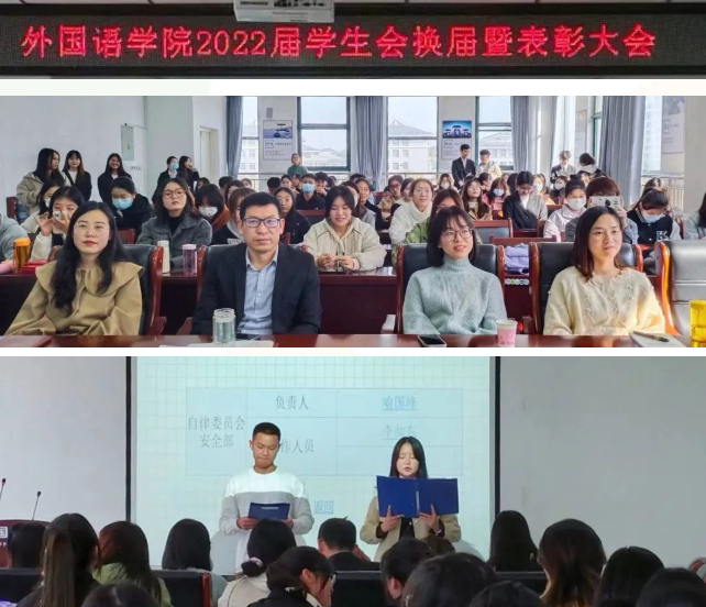 11月14日,外国语学院在人文艺术楼402举办了2022届学生会换届暨表彰大会。外国语学院党总支副书记吴宏,团总支书记高宇,优秀辅导员代表关迎雪、李丹出席本次活动,22级学生代表参与。