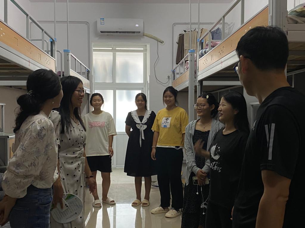 迎新现场,院青马工程志愿服务队和学生党员秉承奉献、友爱、互助、进步的志愿精神,主动接下新生行李,用热情的微笑和喜悦的汗水让萌宝们感受外国语学院师生的欢迎与关怀。院学生会各部门也各司其职,为本次迎新保驾护航:大家于南大门、校训石旁高举指示牌,耐心等待远道而来的新生,悉心为其指引道路;资助服务部在资助专员张豫老师的指导下协助新生办理助学贷款等事务,为学生解决后顾之忧;学院啦啦操表演带动全场氛围,尽展外国语学院的新风貌、新活力新媒体工作室用相机记录下萌宝们加入外院大家庭的精彩瞬间,将洋溢在新生与家长脸上的激动与喜悦永恒定格。学院师生以饱满昂扬的精神状态有序完成迎新工作,得到了新生及家长的高度肯定。迎新期间,学院领导深入新生宿舍,亲切关怀新生的身心适应状况和生活需求。