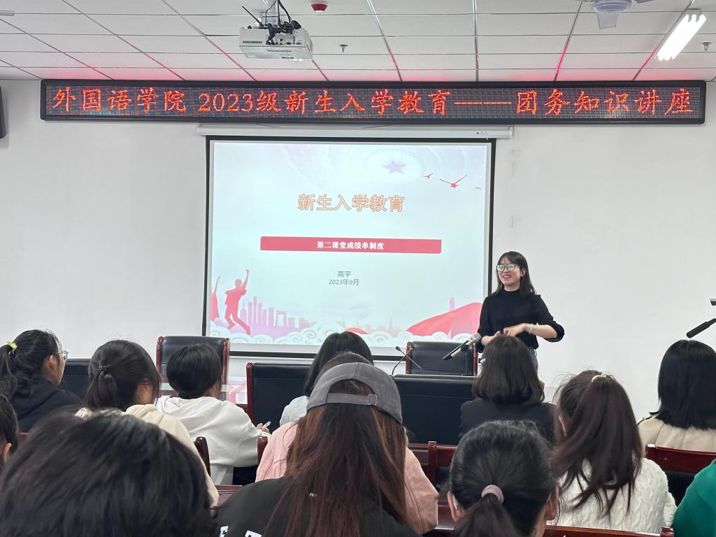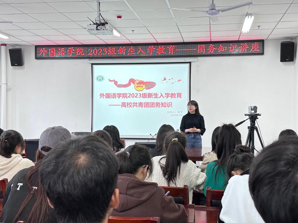 2023年9月25日上午,外国语学院于文学艺术楼402开展了团务知识讲座,讲座由院团总支书记高宇主讲,2023级全体新生参加。