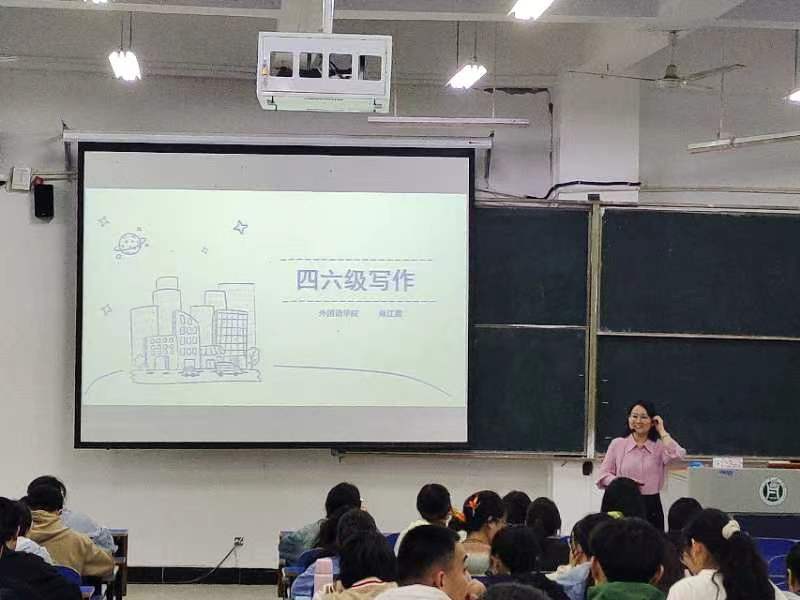 2024年4月11日19:00-20:30,外国语学院四六级辅导团队于一教E102开展了四六级辅导讲座第三讲,本次讲座主讲人为外国语学院韩江霞老师,全校近300名学生参加了本次讲座。