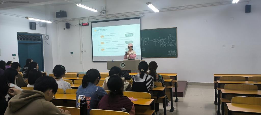活动分为四个环节。在创意黑板报环节,大家在黑板上画出了心目中的秋节元素——月亮、月饼、兔子、灯笼等,丰富多彩,形态各异;在中秋节的来历和风俗讲解环节,大家通过 PPT 和视频的形式,分享了中秋节的起源、特色传统食品、习俗和意义等,深入了解了中秋节的内涵和价值;在诵读展示和互评环节,大家用优美朗诵,表达了对中秋节的感悟和理解,互评朗诵效果;活动最后,社团为大家准备了节日纪念品,让大家在参与活动的同时,更感受到节日的气氛和祝福。