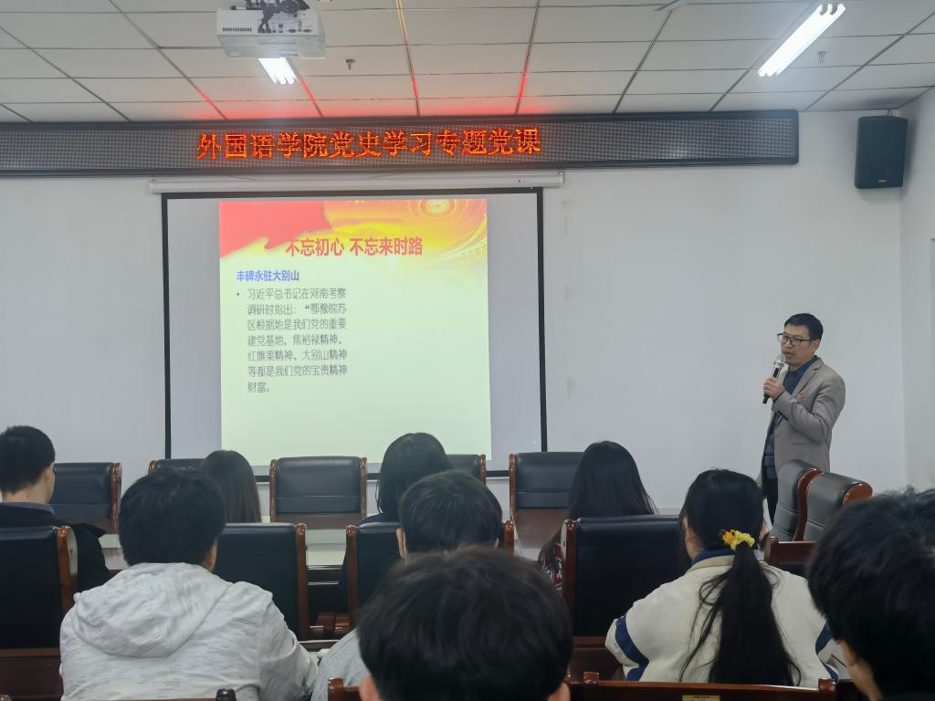 11月25日上午,外国语学院在文学艺术中心402召开党史学习专题党课,此次党课由学院党总支副书记吴宏老师主讲,外国语学院全体学生党员、学生干部聆听了此次党课。