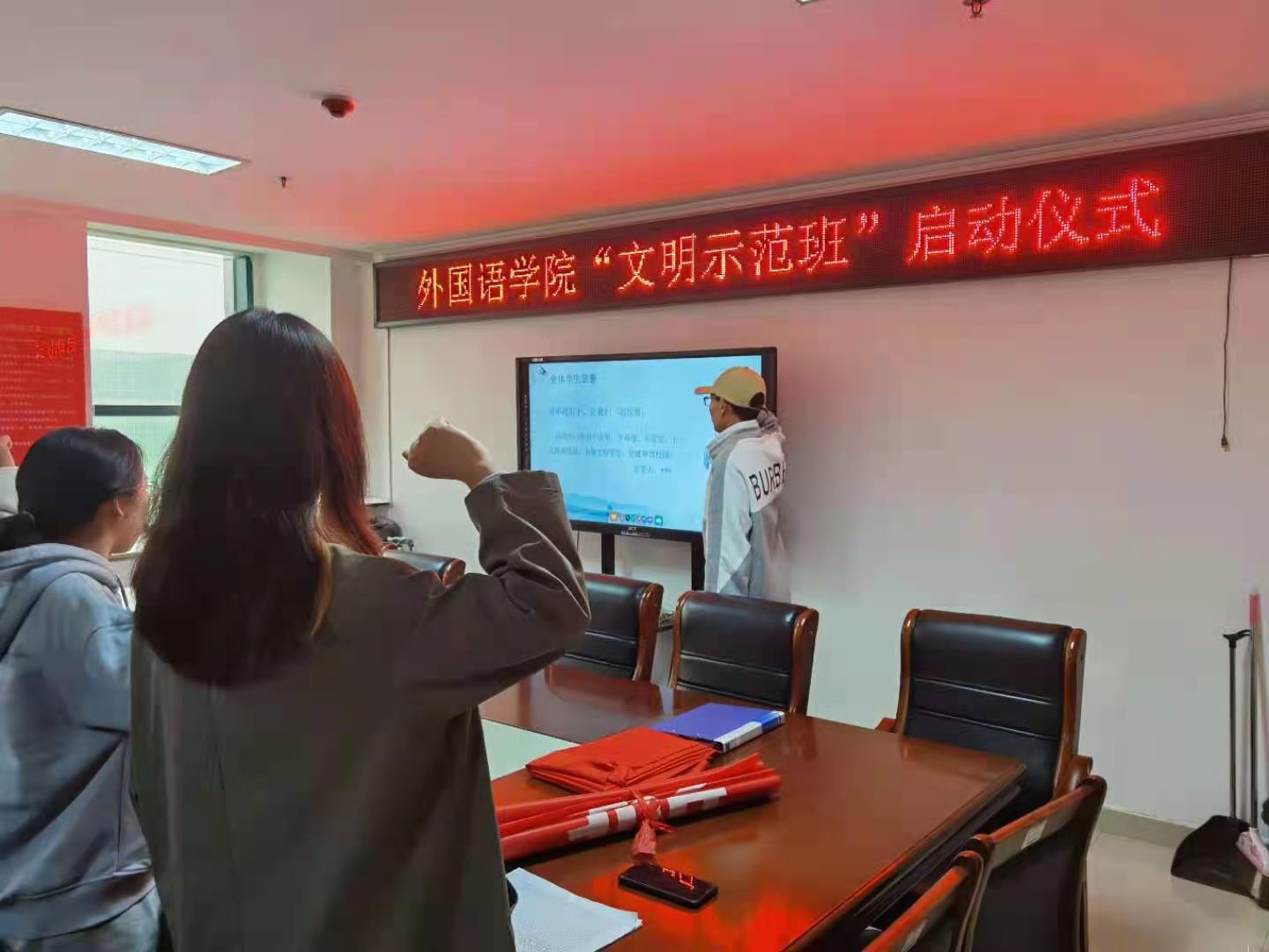 活动最后,商英20-1文明示范班班长带领示范班全体学生宣誓,向不文明、不和谐、不友爱、不卫生现象宣战,争做文明学生,创建和谐校园!外国语学院努力将文明教育作为一项常规工作坚持不懈地开展下去,让文明之风常驻班级,让文明之风弥散校园。