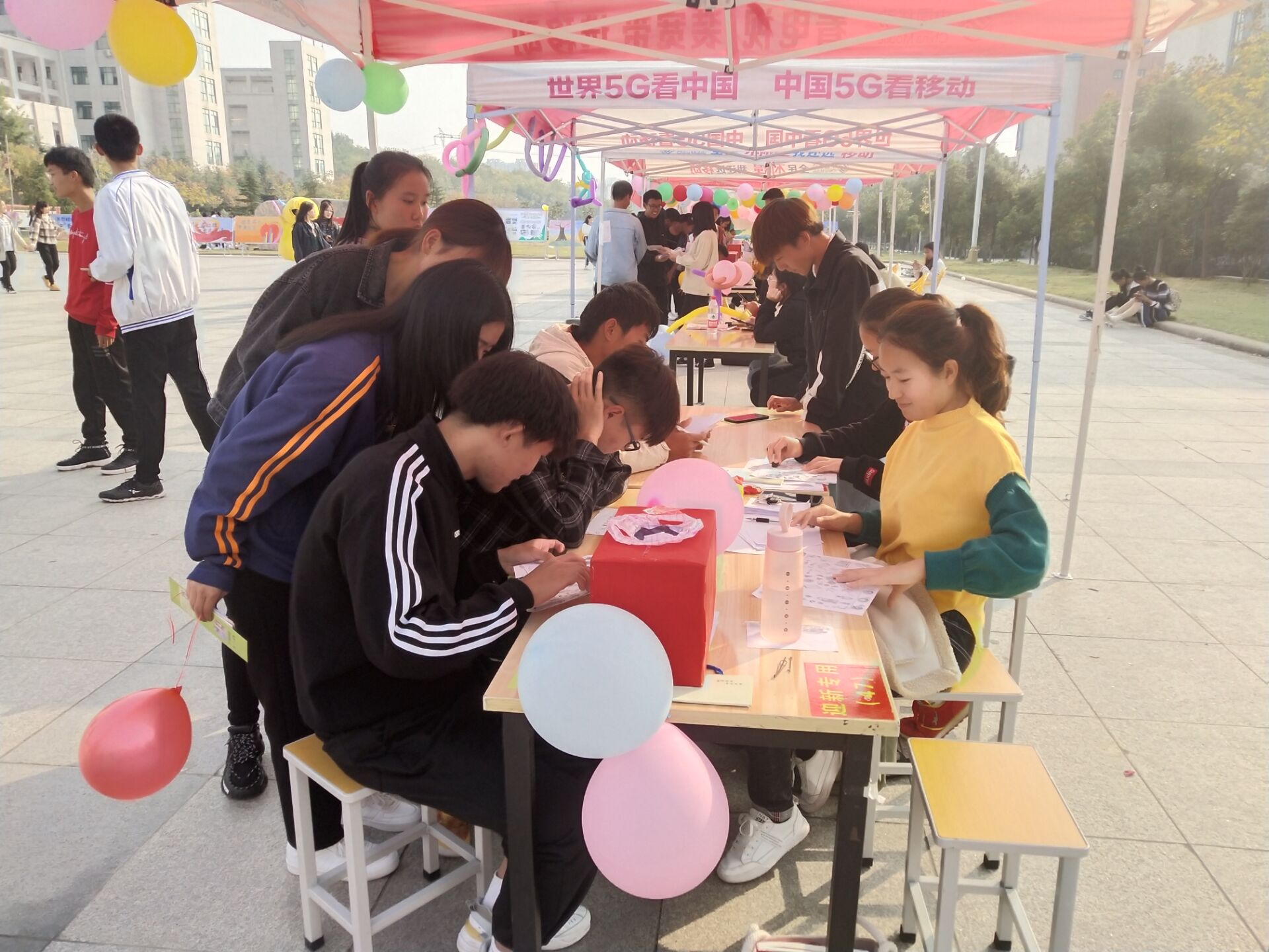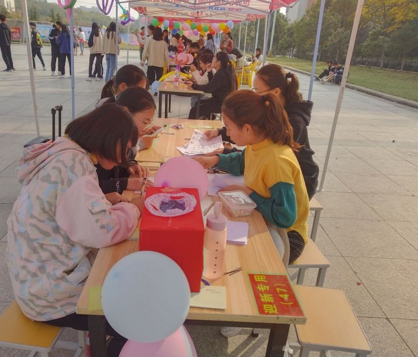 活动还未开始,负责活动的同学们便开始了准备工作,他们搭起了帐篷,摆好桌子凳子,把活游戏需要的道具,奖品准备就绪。下课铃声响后便迎来了许多积极参与的同学同学们通过参与“大家来找茬”,“抢凳子”,“画简笔画”,“踩气球”等小游戏,不仅得到了精美的小礼品,也在紧张学习的压力下得到了放松在游戏结束后同学们参与了“陌生人你好”活动,参加活动的同学可以用便利贴的形式随机抽出一张纸条,在上面给陌生人写出一句励的话后再把纸条放回箱子中在鼓他人的同时,同学们也得到了他人的鼓励活动最后,两部成员整理现场,清扫现场卫生,维护校园卫生