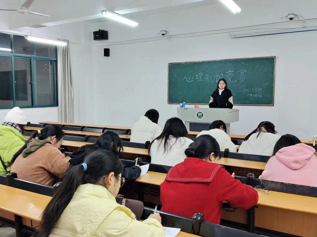 为了解同学们心理健康状态,丰富同学们的心理健康知识。外国语学院心理健康部于11月11日晚在教二楼114教室举办心理健康知识竞赛,新生班级心理委员全员参与。