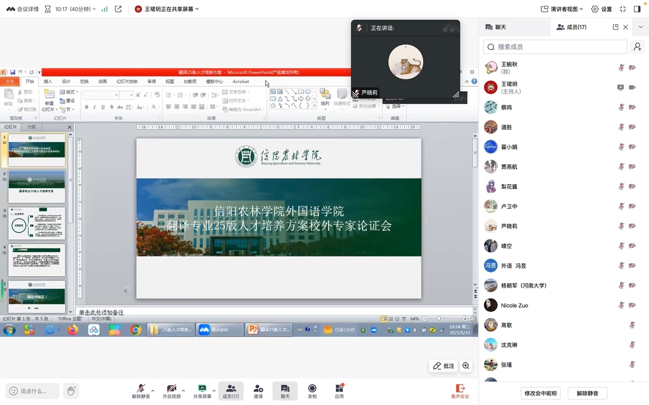 王珺玥首先介绍了学校2025版人才培养方案制定工作的指导思想,尤其对新文科背景下高素质应用型翻译人才的培养目标进行了汇报。专家组成员一致对翻译专业制定的人才培养方案给予肯定,同时,提出了一些针对性意见和建议:杨朝军建议强化农林特色定位,增加翻译技术、学术研究能力培养,优化课程结构与职业导师参与机制;卢卫中强调应结合国家标准与区域特色,压缩基础课程比重,注重翻译传播能力与行业证书引导;翟小娟从行业角度建议加强校企合作,融入实战化语料与案例教学。与会人员与专家进行了深入交流。