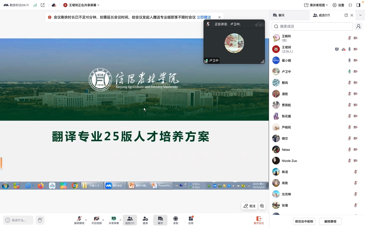 513日晚730分,外国语学院组织召开翻译专业2025版人才培养方案专家论证会,会议以线上形式进行。本次论证会特邀河南大学外国语学院杨朝军教授、浙大城市学院外国语学院卢卫中教授、行业专家郑州译线通翻译公司首席执行官翟小娟参加。外国语学院院长芦晓莉、副院长蔡鸣、冯昱,翻译教研室主任王珺玥、副主任吴甜甜及骨干教师代表参会。会议由翻译教研室主任王珺玥主持。