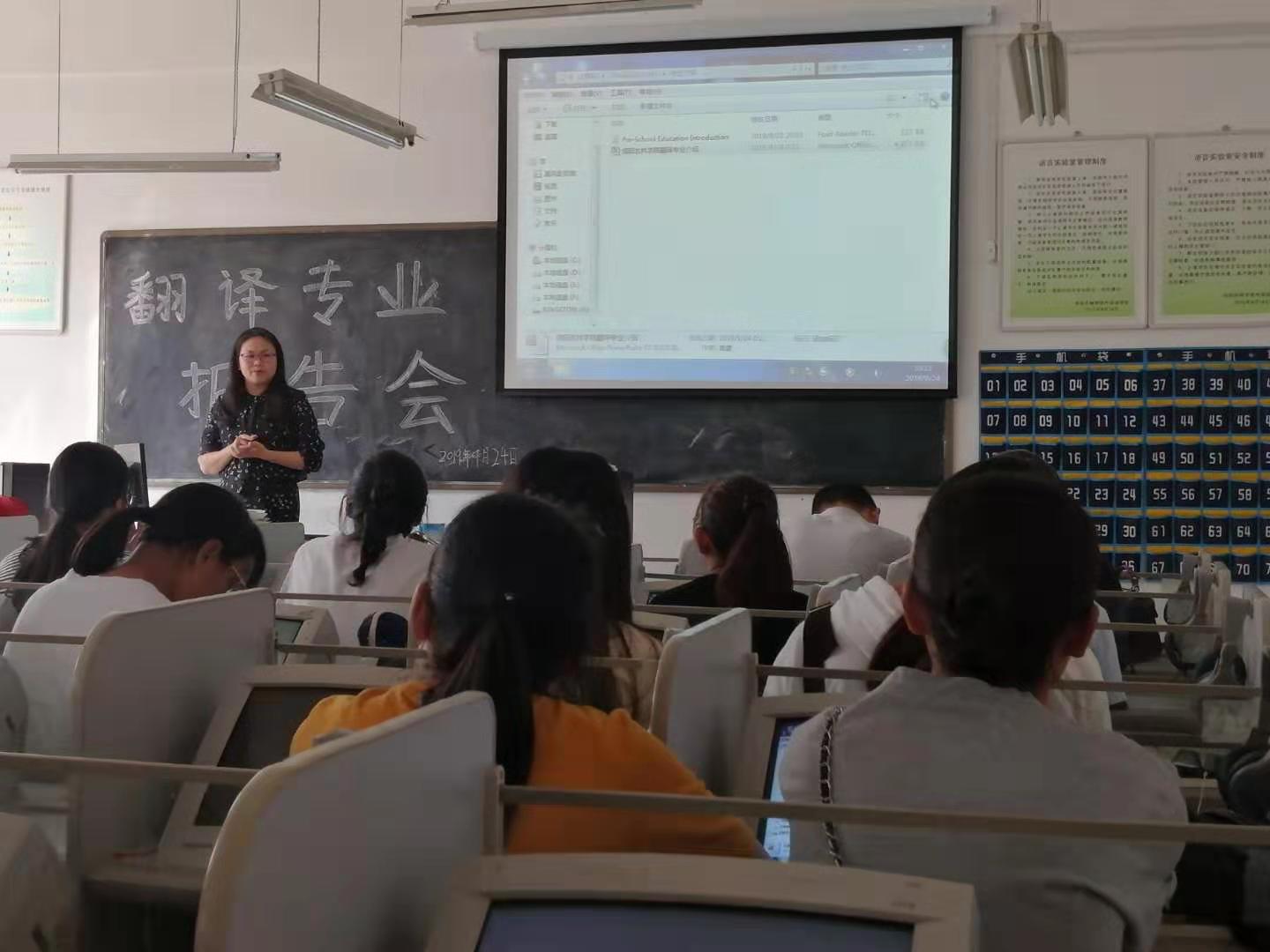参与介绍会的还有翻译教研室骨干教师王珺玥、魏君仪、蒋博如、闫达,他们向同学们介绍了翻译专业及就业前景。老师们以自己的亲身经历告诉同学们,大学期间,要树立远大的目标,找到适合自己的学习方法。