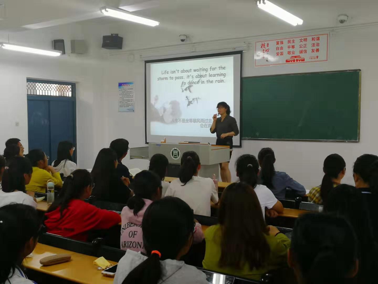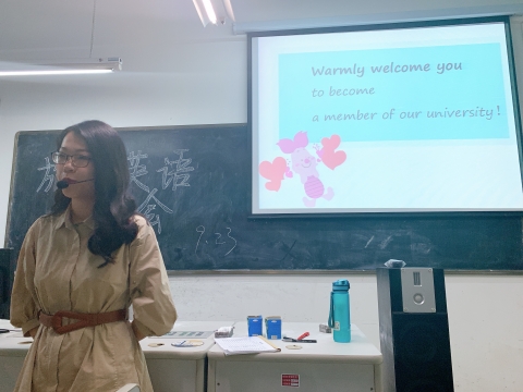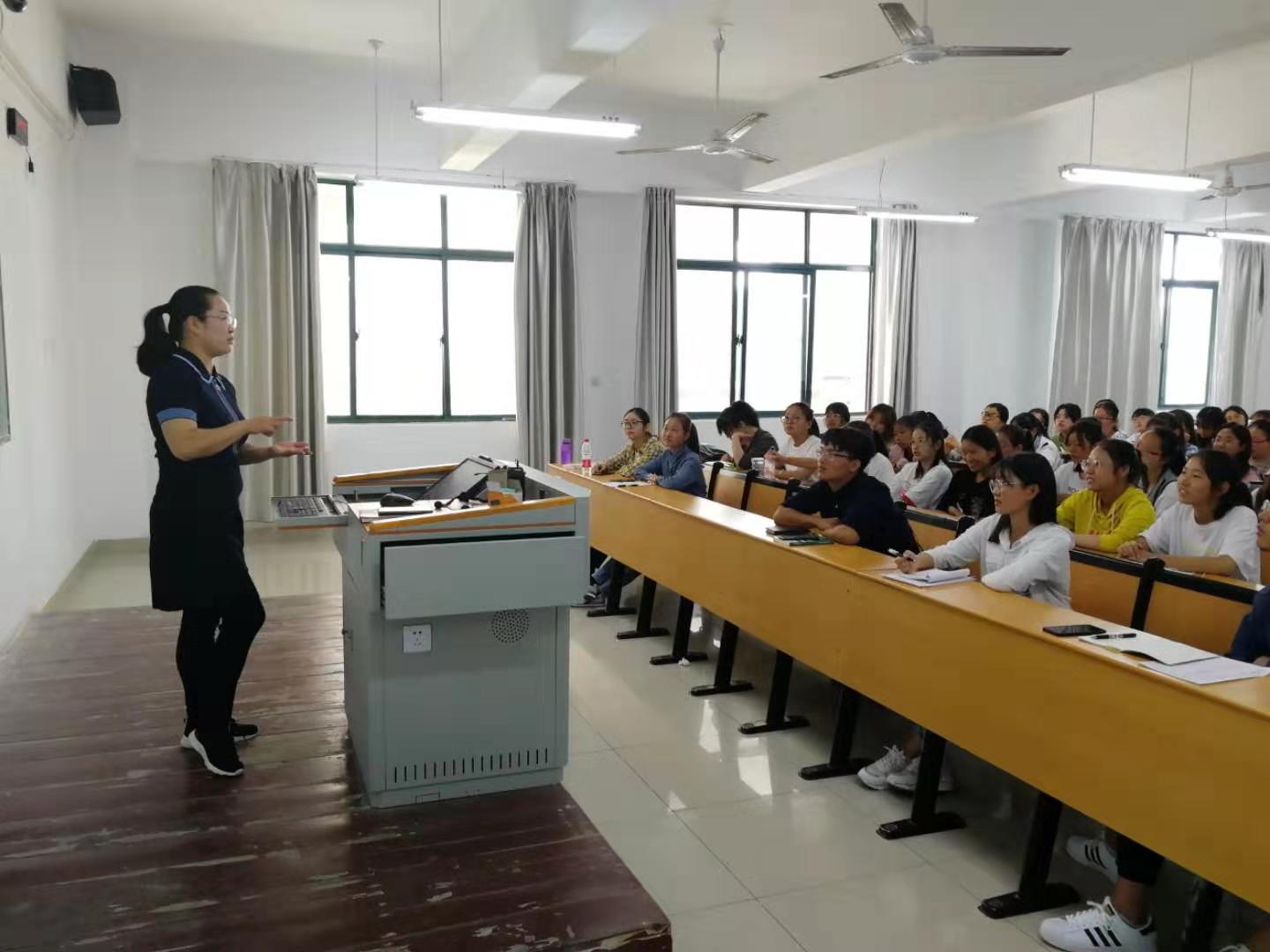 骨干教师代表张霞向同学们讲解了商务英语专业的定义,并分析了本专业的定位及毕业发展前景,为同学指明了以后奋斗的目标。