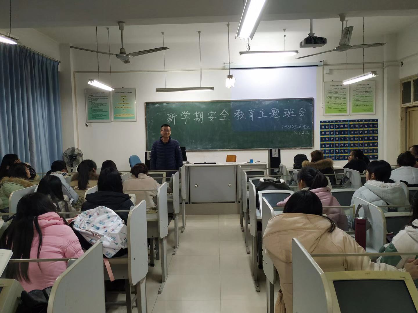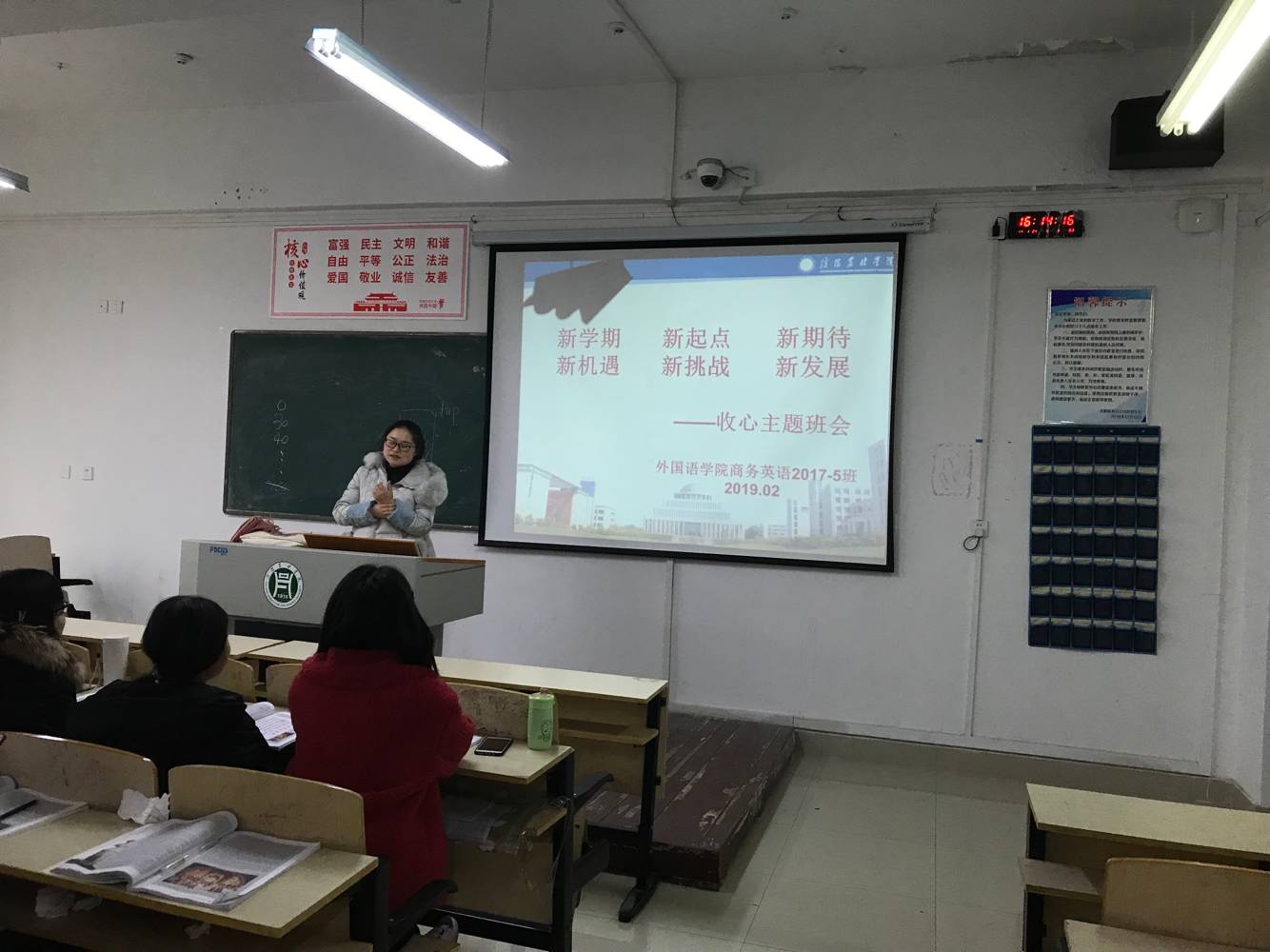 班会上,辅导员老师提出了新学期的“五心”——收心、决心、恒心、爱心、用心,希望同学们在新的学期有新的开始,下定决心,学习上持之以恒,战胜困难,提高品德修养,尊师爱友,孝顺父母、用心做人,做学问;班会最后,辅导员们鼓励学生们积极备考专业考试,努力完善自己。