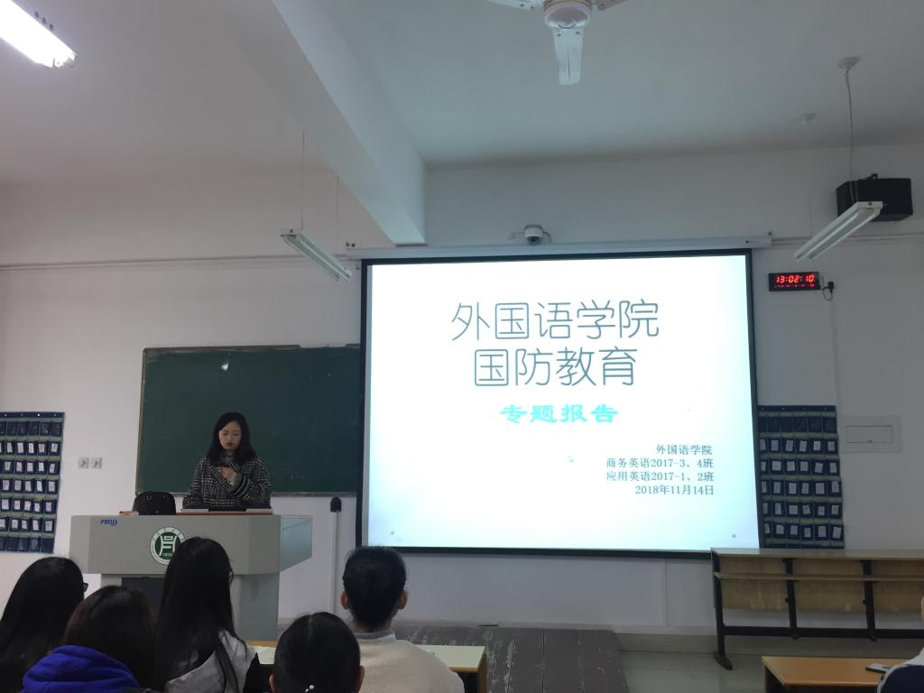为了积极推崇“崇军尚武、爱我中华”的理念,营造全院关注国防、支持国防、热爱国防的浓厚氛围。2018年11月14日,外国语学院在二教101举行了国防教育报告会。会议由我院武装专干朱俊梵老师主持,2017级全体学生参加了此次报告会。