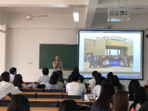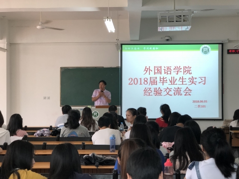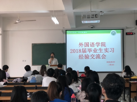 大学生实习是培养适应社会发展的高素质人才的重要的实践教学环节,是高等教育教学的重要组成部分,是帮助大学生更好地实现就业的重要途径。为了解2018届毕业生的实习成果,同时为更好地开展2019届应用英语专业的教育实习工作,6月1日上午9:00,外国语学院在二教101举办了外国语学院2018届毕业生实习经验交流会。外国语学院院长滕海、党总支书记张志强、学工组副组长吴宏、就业专员闫达老师、毕业班辅导员赵瑞老师、辅导员陆岱宝老师以及2015级、2016级应用英语专业全体学生参加了此次交流会。会议由教学秘书蔡鸣老师主持。