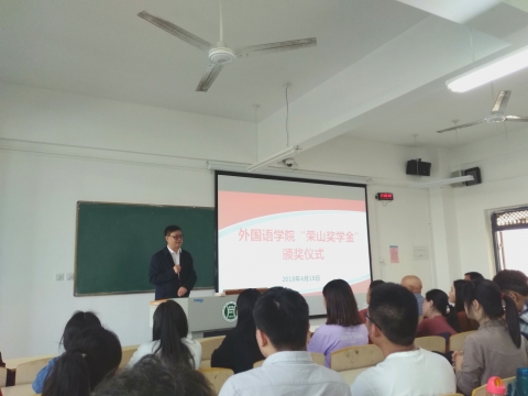 2018年4月18日,外国语学院与上天梯非金属矿管理区荣山集团在二教201举办了“荣山奖学金”颁奖仪式。上天梯管理区党委副书记、副主任侯贵文、上天梯矿业有限公司董事长张照海、荣山公司总经理王志斌、外国语学院院长滕海、党总支书记张志强、组织员吴宏、团总支书记范琼琼、辅导员朱俊梵及学生代表参加了本次颁奖仪式。
