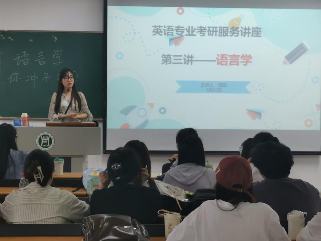 2024521日晚上7:00以及524日晚7:00,外国语学院在二教107先后开展了英语专业考研服务讲座第三讲——语言学专业考研的指导讲座。讲座分别由陈嘉老师和李光莉老师主持,我院21级商务英语和翻译专业志愿考研的学生参加了本次讲座。