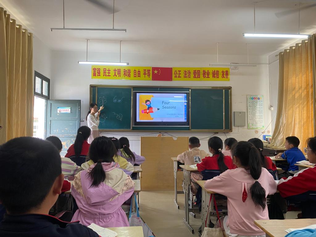 本次活动分为示范课展示、教学教研、讨论交流等环节。在示范课上,外国语学院黄琳老师为五年级学生上了一堂英语教学示范课“Four Seasons”。针对小学生好奇心强和活泼好动的特点,黄琳老师在课上引导学生们从视觉、听觉、动觉等多方感官体验四季。这节课还融入了家乡信阳的景点和活动,在练习口语的同时,提升了学生们对家乡的了解和热爱。示范课的尾声,黄琳老师将课堂内容引向了中华传统节日——清明节。她为学生们讲述了清明祭奠祖先和先烈的习俗,引导学生们深入思考这一节日背后的深刻内涵。黄琳老师强调,现今我们享有的幸福生活来之不易,它凝聚着无数先辈的奋斗与牺牲。她希望学生们能够加倍珍惜今天的幸福生活,努力学习,踏实奋进,做好新时代的接班人。