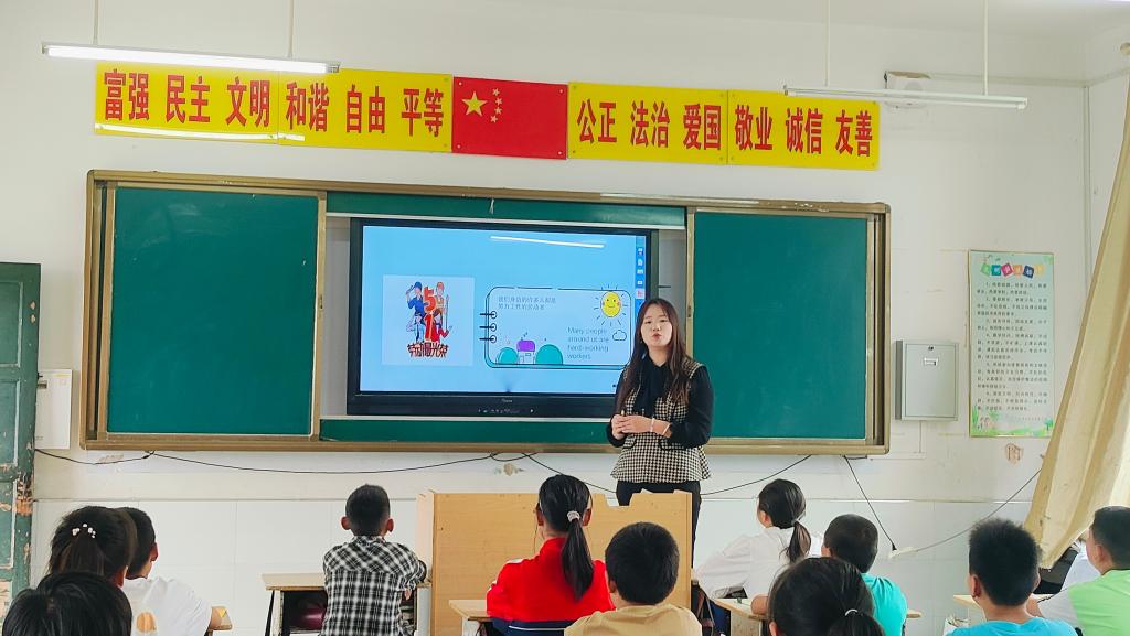活动伊始,2023级商务英语专业的崔欣蓉同学给五年级的学生们上了一节生动的劳动教育课,强调了劳动在个人成长和社会进步中的重要作用,鼓励学生们积极参与劳动,体验劳动的乐趣,感受劳动的价值。与此同时,在丰富有趣的课堂教学活动中,2022级商务英语专业的席文君同学带领同学们一起学习了蔬菜相关的英文单词