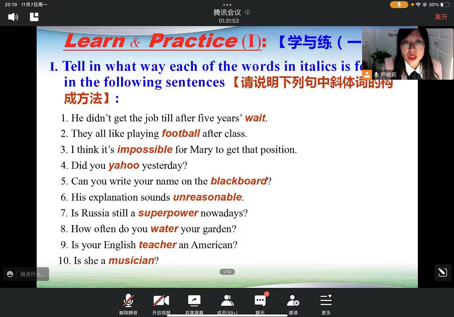 讲座伊始,芦晓莉博士分析了考研后期考生可能存在的一些关于英语词汇学习的现状问题,并就问题背后的本质原因进行了剖析,为本次讲座奠定了理论基础。然后,围绕“词与词汇”、“词汇的重要性”、“主要构词法”、“生词的处理”等重难点内容进行了系统、全面的讲解。其间还穿插了“learn and practice”的互动环节,旨在更好地将理论和实践相结合,达到学以致用的高质量培训效果。