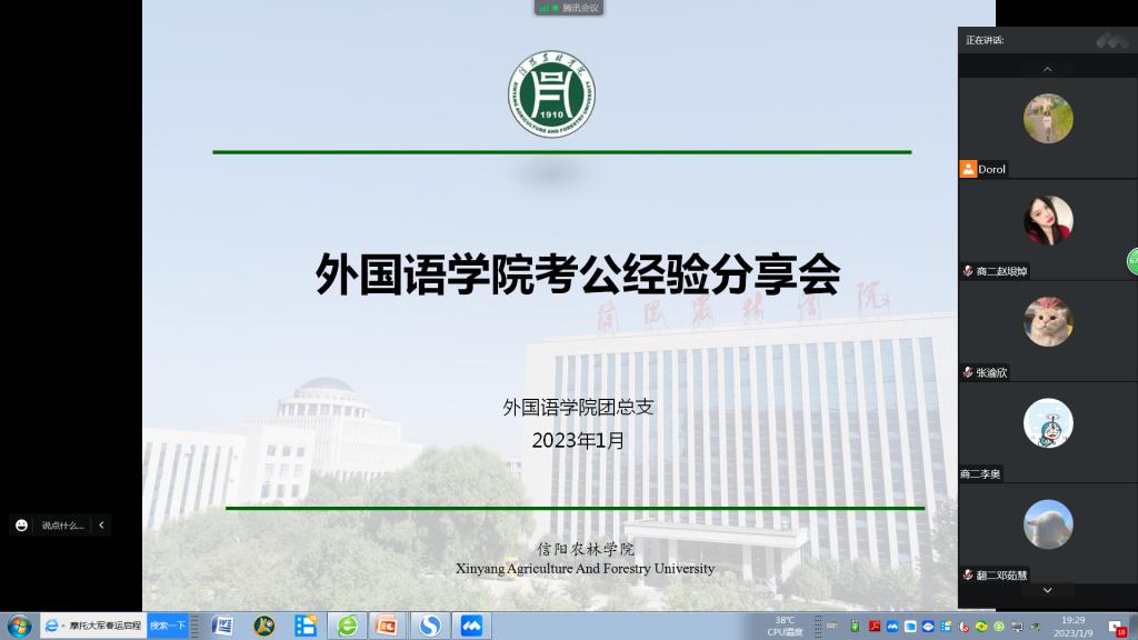 为帮助学院学生更好地了解公务员考试,尽早并更好地规划未来发展,2023年1月9日晚,外国语学院团总支邀请毕业生、商务英语2018-1班刘晨雨在线上开展了一期公务员考试经验分享会。会议由学院团总支书记高宇主持,19级、20级学生参加。