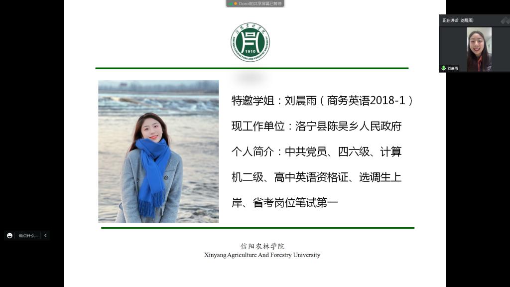 刘晨雨同学于2021年成功通过河南省选调优秀应届大学毕业生到基层工作考试,现于洛宁县陈吴乡人民政府工作。会上,刘晨雨分别针对国考、河南省考、选调生考试这三种常见公务员考试类型进行了详细的介绍,对不同类型考试的招录单位、考试内容等基本信息进行了全面讲解,根据不同类型的考试特点提出了针对性备考建议,着重分享了自己笔试和面试环节的备考经验。会议最后,同学们在线上踊跃提出了自己的困惑,刘晨雨同学一一详细解答,同学们收获满满。