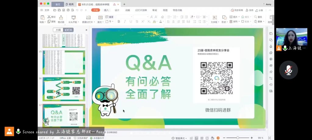 为让2023届毕业生能够在当今严峻的就业环境下乘风破浪,了解最新就业形势以便后期更顺利地就业。9月15日和9月16日下午,外国语学院结合就业指导课线上举办“上海链家——校友分享会”,双创中心谌昌强老师,外国语学院就业专员关迎雪老师以及2023届全体毕业生参加此次分享会。