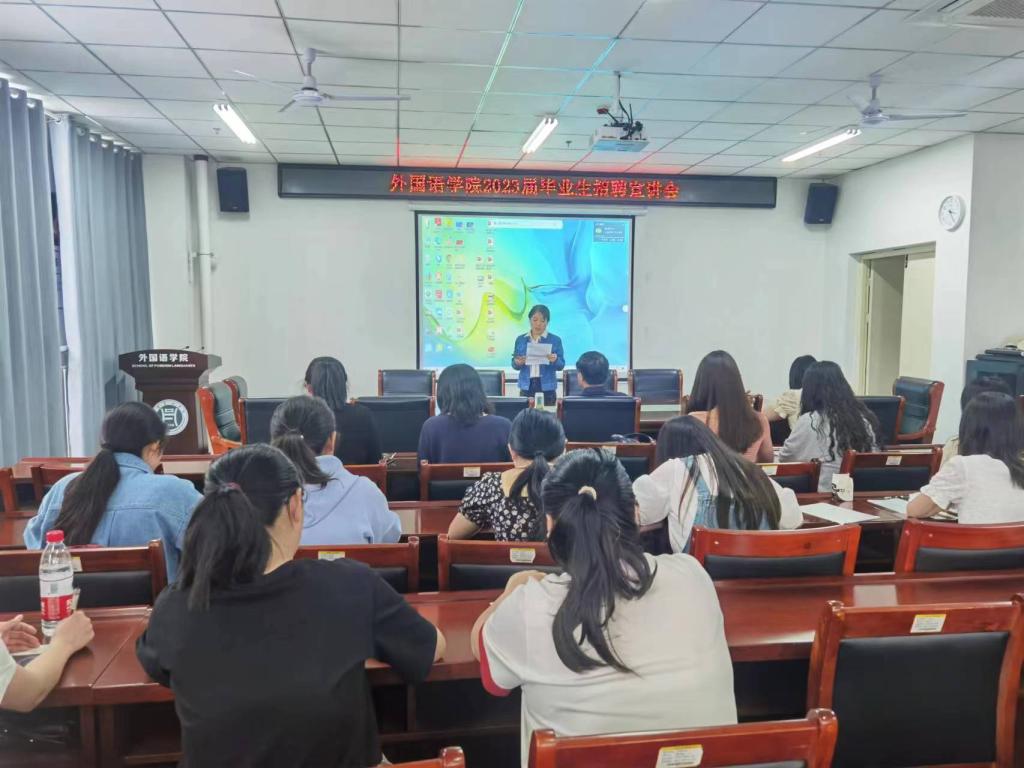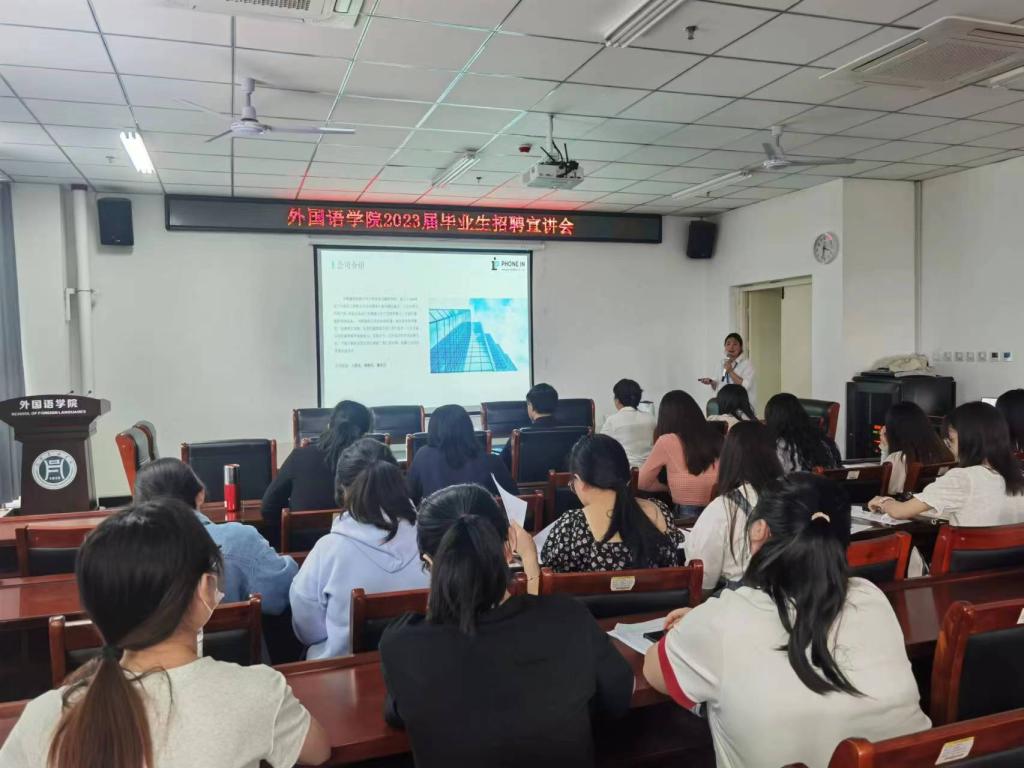 外国语学院于5月23日在文学艺术楼402举办2023届毕业生线下招聘宣讲会,德佑房地产经纪有限公司、信阳圆创磁电科技有限公司、河南乐畔电子商务有限公司三家企业来院进行招聘宣讲。学院党总支书记张志强、副院长冯昱、办公室主任徐文君、就业专员关迎雪以及学院部分代表老师出席此次宣讲会,部分还未就业的2023届毕业生参加了此次宣讲会。