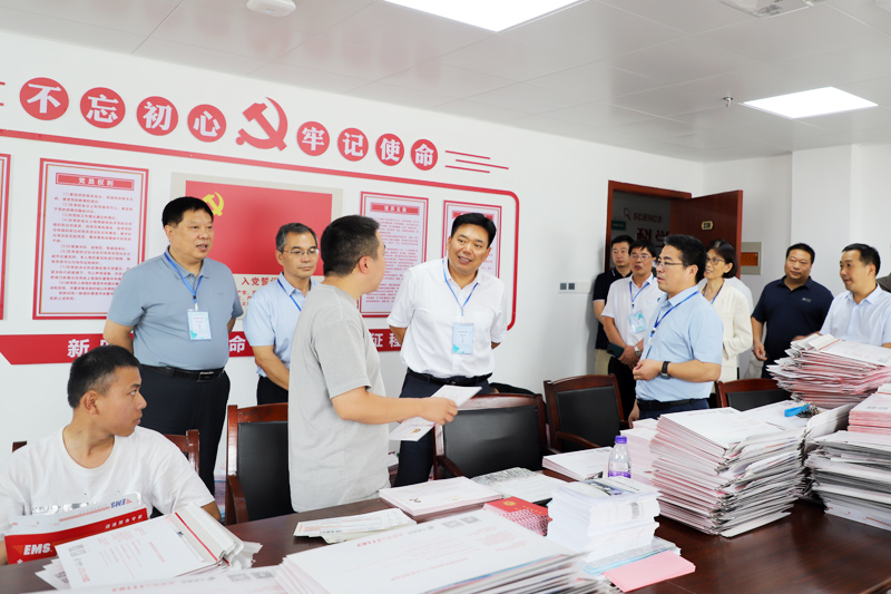 在招生录取工作现场,黄松一行检查了招生办公室、招生录取大厅以及新生录取通知书的寄发情况,并听取了招生就业处处长胡显淼关于2023年招生宣传、招生录取准备、各批次录取进展及生源情况的汇报。
