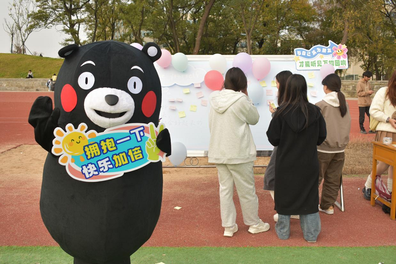 在心理素质拓展区,来自各学院的16支参赛团队在“不倒森林”“一圈到底”“珠行万里”“击鼓颠球”“企鹅漫步”“齐心运球”等六个协作挑战项目中全情投入、默契配合,在欢乐竞技中彰显了团队协作的力量与青春活力,让活动成为一场凝聚人心、展现风采的精彩盛会。在艺术涂鸦区里,大家手握画笔尽情释放灵感,缤纷颜料与画纸激情碰撞,既铺展开一场绚烂吸睛的视觉盛宴,更化作一次治愈心灵、舒缓压力的沉浸式体验。在趣味游戏区,欢乐踢毽子比拼、经典扔沙包互动、趣味解压气球等活动现场热闹非凡,笑声不断。智能心理健康体检车搭载的AI心理测评系统、智能心理减压舱、脑波闪电侠等设备,凭借科技赋能的创新心理服务,成功吸引了广大师生的目光。