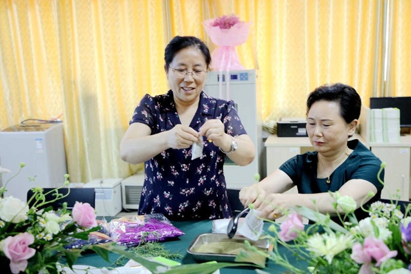 生物与制药工程学院陈琼教授介绍了自己的“医药家庭”和她从事药品生产质量管理工作的经历,以及近几年来带领河南省中药材产业服务团在服务地方经济、助力脱贫攻坚的心得体会。大家在陈琼教授的指导下,一起制作了迷迭香香包、精油皂、精油唇膏等,亲身感受到了迷迭香产品的魅力。