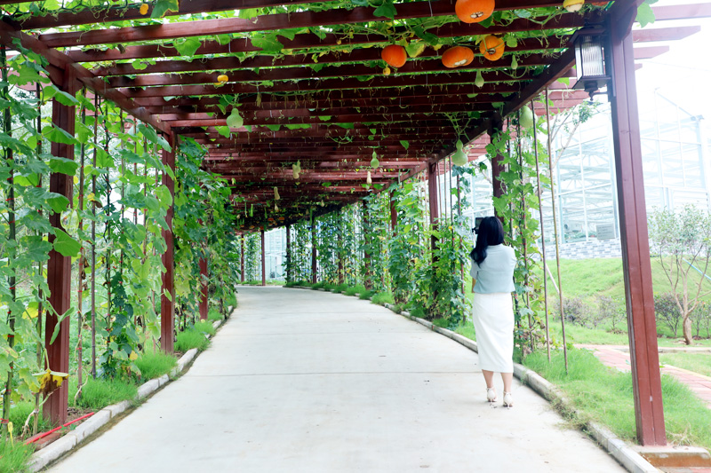 走进园艺学院教学实习基地,仿佛置身于花果海洋,在阳光照耀下,瓜果廊架顶上五彩斑斓的南瓜、葫芦、丝瓜闪闪发光,月季园的月季争奇斗艳,观赏草园区异彩纷呈,康养花园娴静而美好,智慧物联网温室有序运转着……