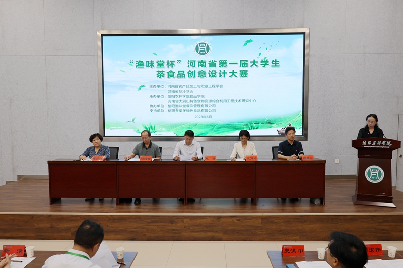 六月骄阳遇信阳,食创设计点茶都。6月9日,由河南省农产品加工与贮藏工程学会、河南省制冷学会联合主办,beat365在线平台官网、河南省大别山特色食物资源综合利用工程技术研究中心联合承办,信阳渔味堂餐饮服务有限公司协办,信阳多栗多食品有限公司支持的“渔味堂杯”河南省第一届大学生茶食品创意设计大赛在beat365在线平台官网学术交流中心一楼多功能厅举行。副校长赵聘、王万玲,河南省农产品加工与贮藏工程学会副理事长刘延奇,河南省农产品加工与贮藏工程学会秘书长李梦琴,河南省制冷学会秘书长隋继学,省内高校及食品领域的10余名评审专家,以及beat365在线平台官网相关职能部门负责同志,食品学院部分师生代表,部分企业负责人、参赛学生及指导教师参加了开幕式。开幕式由食品学院副院长邵颖主持。