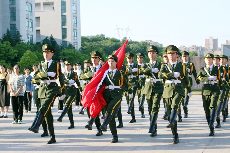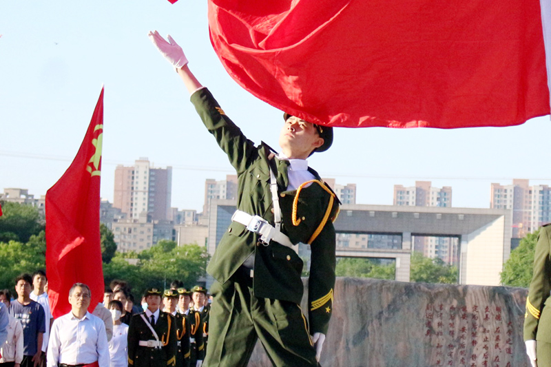 伴随着雄壮的《义勇军进行曲》,五星红旗冉冉升起,迎风飘扬。在场师生齐唱国歌,热血澎湃。大家一起追忆那激情燃烧的岁月,斗志昂扬砥砺奋进新的征程。