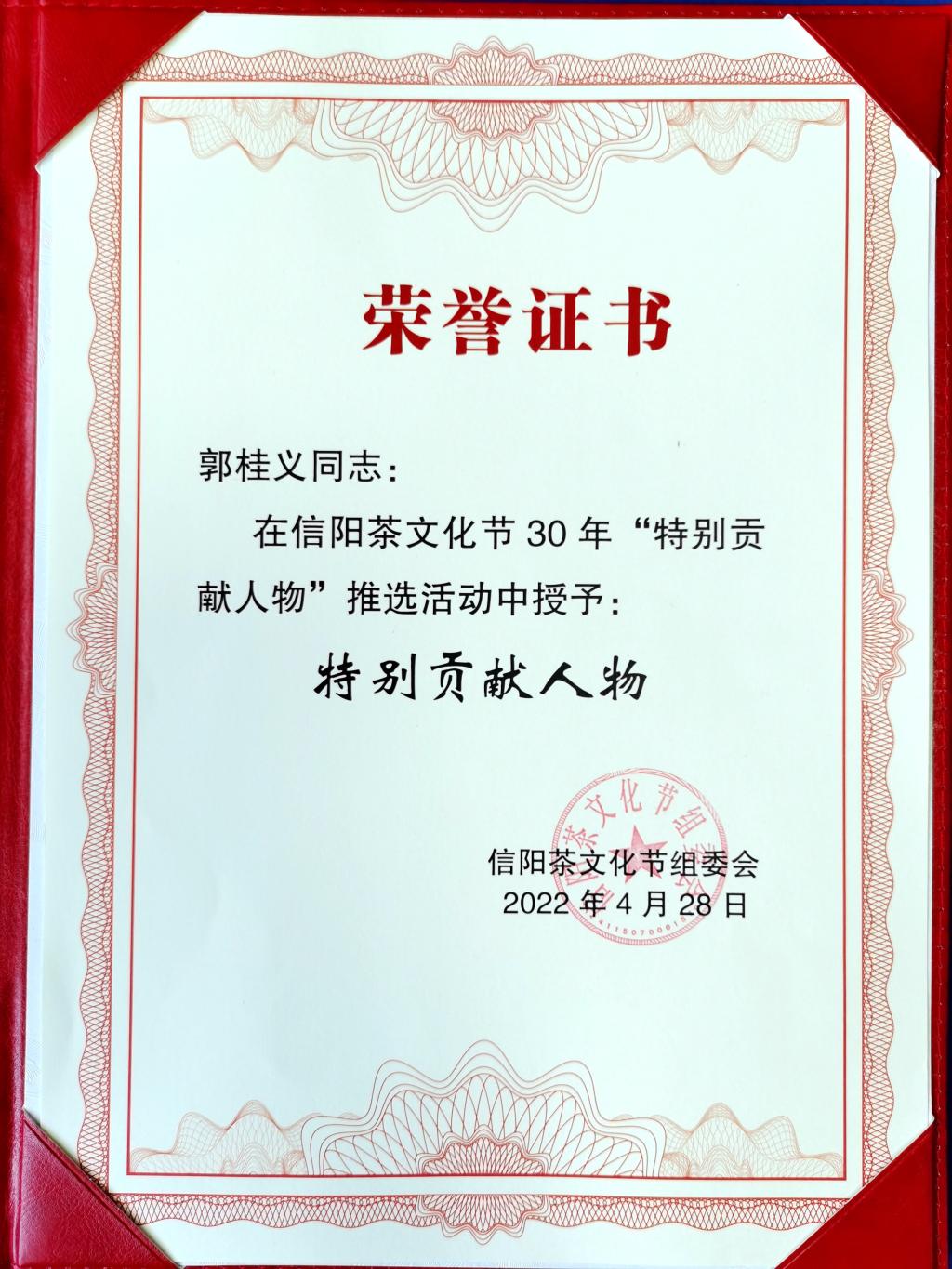信阳茶文化节举办30年来,信阳茶产业、茶科技、茶文化等方面取得了令人瞩目的辉煌成就,“信阳毛尖”的知名度、影响力和品牌价值持续提升,已成为信阳市最亮丽的“金名片”,为全市经济社会发展做出了突出贡献。这是全市各级各部门高度重视和各行各业共同奋斗的结果。为表彰先进、树立典型,信阳茶文化节组委会在第 30 届信阳茶文化节期间开展了“信阳茶文化节30年特别贡献人物推选活动”。按照《关于开展信阳茶文化节30年“特别贡献人物”推选活动的通知》(信茶办〔2022〕2号)文件要求,经单位推荐、资格审核、专家评审,结合有关部门审查意见, 4月28日,在第30届信阳茶文化节开幕式上,信阳茶文化节30年“特别贡献人物”30名正式发布,郭桂义教授位列第一,充分肯定了郭桂义教授40年来为信阳市茶产业的发展所做的贡献。