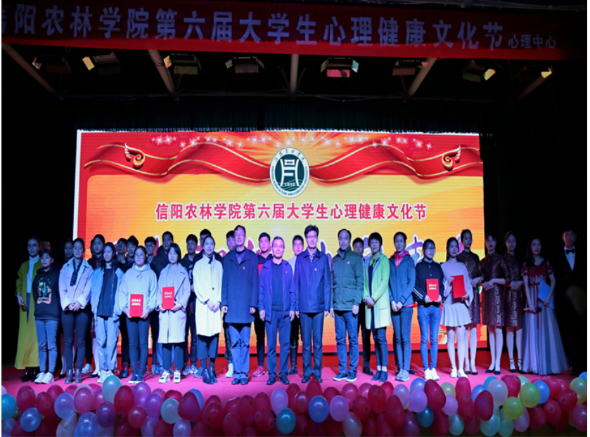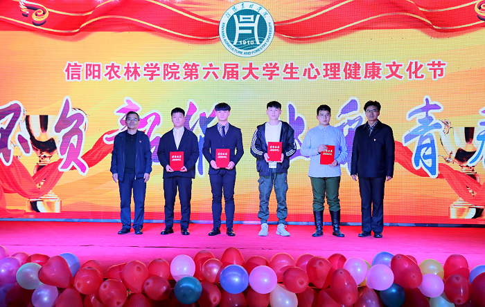 在宣传预热环节中,心理中心、各教学院部、校学生会心理部、阳光心理社团分别在汝宁广场放置宣传展板、在校园悬挂宣传标语;在第二个环节中,各教学院部通过学生干部专题培训、主题班会、辩论赛、心理问卷调查与排查、漫画比赛、征文比赛、心理情景剧初赛、心理健康知识竞赛、心理电影展播和专题讲座等多途径开展了丰富多彩的主题活动;在第三个环节中,15个院部代表队经过“心心相印”、“两人三足”、“人椅”、“趣味毛毛虫”等四个项目的激烈角逐后,食品学院代表队获得团体一等奖,茶学院代表队、水产学院代表队获得团体二等奖,信息工程学院代表队、林学院代表队、旅游管理学院代表队获得团体三等奖。在第四个环节中,经初赛、复赛的严格筛选,进入决赛的 7个代表队紧紧围绕“亲情感恩、人际纠纷、青春梦想、合理消费、自我成长”等主题,演绎出了丰富多彩的大学生活;诠释了心理成长历程;最终旅游管理学院作品《最好的自己》、食品学院作品《手机》、农学院作品《勇敢迈出第一步》分获一、二、三等奖,水产学院作品《说不出的爱》、财经学院作品《勇敢说NO》、茶学院作品《我的未来不是梦》、林学院作品《青春不一样》获得优秀奖;农学院袁重庆同学获得最佳男演员奖,旅游管理学院袁文静同学获得最佳女演员奖,林学院作品《青春不一样》获得最佳编剧奖。副校长赵一鹏、副校长王庆兵分别为获奖选手颁奖并合影留念。林学院获得本届心理文化节优秀组织奖。