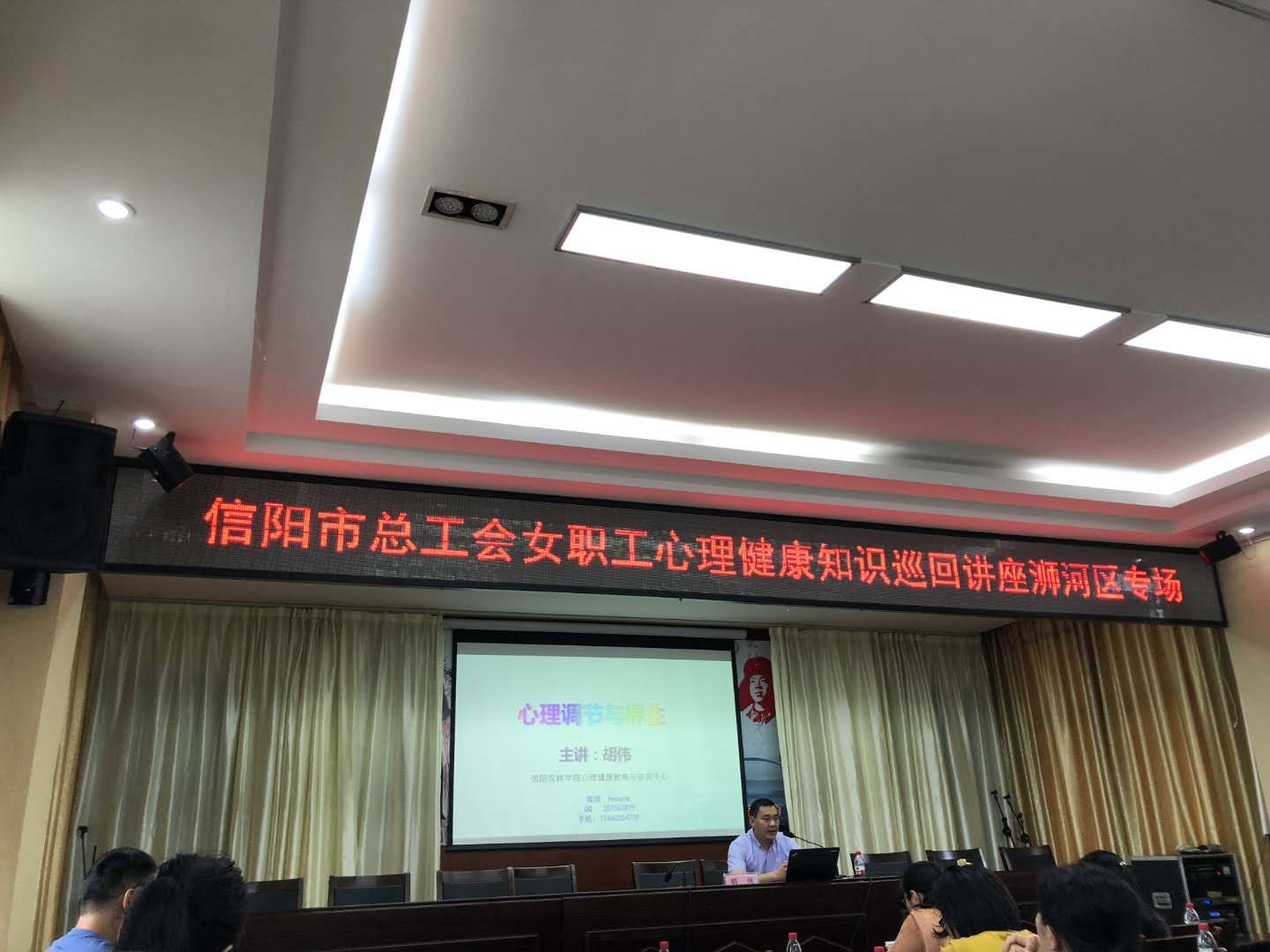 6月21日15时,心理中心胡伟老师应信阳市总工会邀请,在浉河区工会会议室为区直各单位工会女职工做了心理调节与养生的专题讲座。