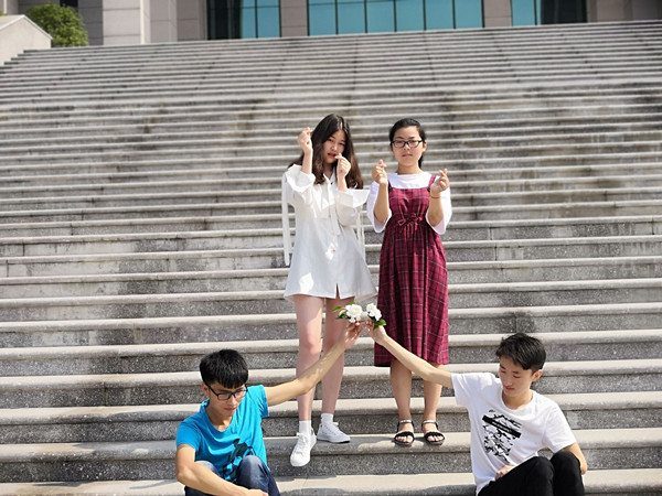 在活动的最后,所有同学一起站在校园图书馆阶梯上摆出心形字样,并向全国大学生致以真诚祝福:
