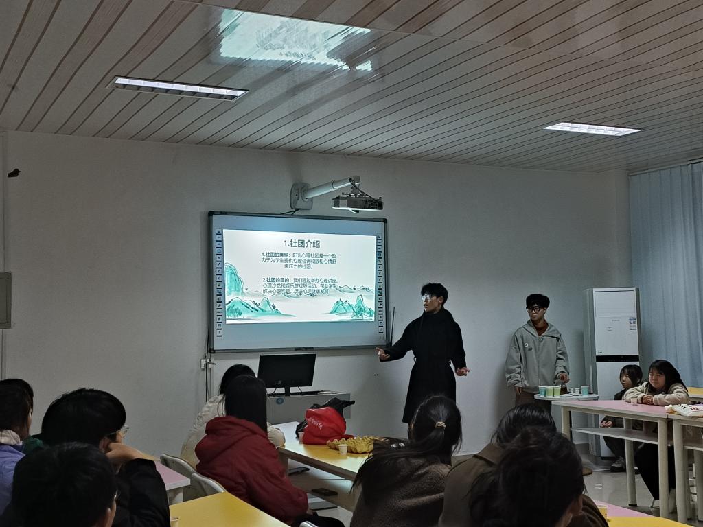 2023年11月12日18:50-20:30阳光心理社团在实验楼2B501举办了以“社团联谊—春雨茶舍”为主题的活动。