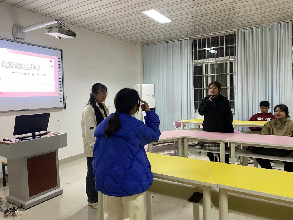 2024年11月18日,阳光心理社团在实验楼2B501举办了一场主题为“共抒温情,同‘心’相伴”的活动。旨在通过通过各种各样的游戏拉进同学们之间的距离,帮助大家交到志同道合的朋友,同时丰富同学们的课余生活,缓解同学们的心理压力。