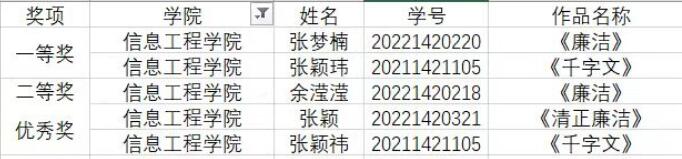 “各种艺术作品百花齐放,从不同角度颂清廉新风、斥慵懒习气,充分展现了信息工程学院崇廉尚廉的良好风貌。”为加强党风廉政建设,丰富学生课余生活,在学生中树立廉洁自律的风气,2023年10月-11月,信息工程学院组织学生向廉洁文化书画摄影作品征集活动投稿,并获得奖次。