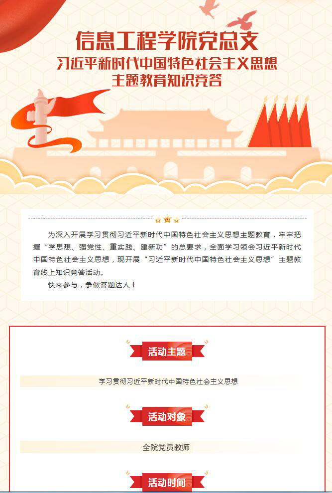 为持续深入推进习近平新时代中国特色社会主义思想主题教育,加强学生的理论学习,提高我院学生的政治素养和综合能力,推动主题教育学习走深走实。信息工程学院党总支于5月30日下午,开展了主题教育线上知识竞答活动,全体学生党员和入党积极分子参与了此次活动。